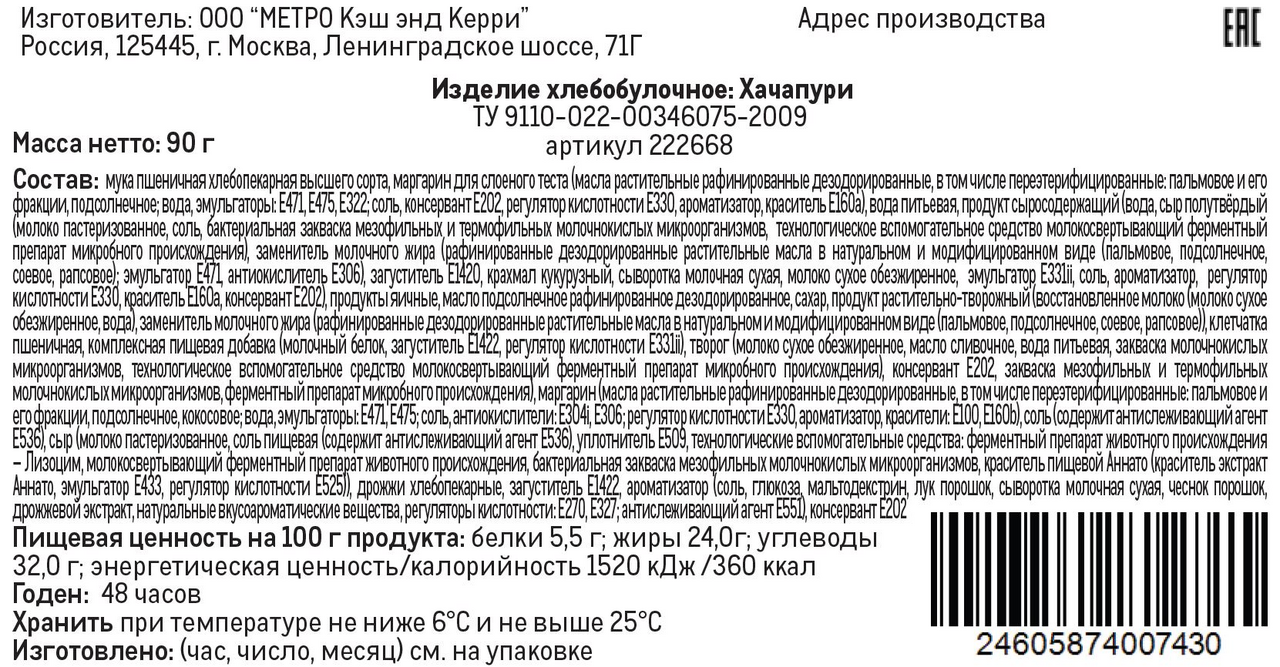 Мука пшеничная хлебопекарная высшего сорта, маргарин для слоеного теста (масла растительные рафинированные дезодорированные, в том числе переэтерифицированные: пальмовое и его фракции, подсолнечное; вода, эмульгаторы: Е471, Е475, Е322; соль, консервант Е202, регулятор кислотности Е330, ароматизатор, краситель Е160а), вода питьевая, продукт сыросодержащий (вода, сыр полутвёрдый (молоко пастеризованное, соль, бактериальная закваска мезофильных и термофильных молочнокислых микроорганизмов, технологическое вспомогательное средство молокосвертывающий ферментный препарат микробного происхождения), заменитель молочного жира (рафинированные дезодорированные растительные масла в натуральном и модифицированном виде (пальмовое, подсолнечное, соевое, рапсовое); эмульгатор Е471, антиокислитель Е306), загуститель Е1420, крахмал кукурузный, сыворотка молочная сухая, молоко сухое обезжиренное, эмульгатор Е331ii, соль, ароматизатор, регулятор кислотности Е330, краситель Е160а, консервант Е202), продукты яичные, масло подсолнечное рафинированное дезодорированное, сахар, продукт растительно-творожный (восстановленное молоко (молоко сухое обезжиренное, вода), заменитель молочного жира (рафинированные дезодорированные растительные масла в натуральном и модифицированном виде (пальмовое, подсолнечное, соевое, рапсовое)), клетчатка пшеничная, комплексная пищевая добавка (молочный белок, загуститель Е1422, регулятор кислотности Е331ii), творог (молоко сухое обезжиренное, масло сливочное, вода питьевая, закваска молочнокислых микроорганизмов, технологическое вспомогательное средство молокосвертывающий ферментный препарат микробного происхождения), консервант Е202, закваска мезофильных и термофильных молочнокислых микроорганизмов, ферментный препарат микробного происхождения), маргарин (масла растительные рафинированные дезодорированные, в том числе переэтерифицированные: пальмовое и его фракции, подсолнечное, кокосовое; вода, эмульгаторы: Е471, Е475; соль, антиокислители: Е304i, Е306; регулятор кислотности Е330, ароматизатор, красители: Е100, Е160b), соль (содержит антислеживающий агент Е536), сыр (молоко пастеризованное, соль пищевая (содержит антислеживающий агент Е536), уплотнитель Е509, технологические вспомогательные средства: ферментный препарат животного происхождения – Лизоцим, молокосвертывающий ферментный препарат животного происхождения, бактериальная закваска мезофильных молочнокислых микроорганизмов, краситель пищевой Аннато (краситель экстракт Аннато, эмульгатор Е433, регулятор кислотности Е525)), дрожжи хлебопекарные, загуститель Е1422, ароматизатор (соль, глюкоза, мальтодекстрин, лук порошок, сыворотка молочная сухая, чеснок порошок, дрожжевой экстракт, натуральные вкусоароматические вещества, регуляторы кислотности: Е270, Е327; антислеживающий агент Е551), консервант Е202.