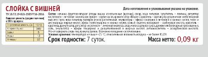 Начинка фруктово-ягодная (ягоды вишни измельченные (кусочки), сахар, вода питьевая, загуститель - пектины, регулятор кислотности - лимонная кислота, консервант - сорбат калия, ароматизатор Вишня, краситель - кармин), мука пшеничная хлебопекарная высшего сорта, вода питьевая, маргарин (масла растительные, эмульгаторы – эфиры глицерина и лимонной и жирных кислот, моно- и диглицериды жирных кислот, эфиры полиглицерина и жирных кислот, соевый лецитин; консервант – сорбиновая кислота, краситель – каротины, ароматизатор, регулятор кислотности – лимонная кислота), сахар, молоко цельное сухое, дрожжи хлебопекарные прессованные, соль, эмульгатор – эфиры глицерина и диацетилвинной и жирных кислот, антиокислитель – аскорбиновая кислота. Может содержать следы яиц, кунжута, орехов. Возможно попадание косточек вишни.