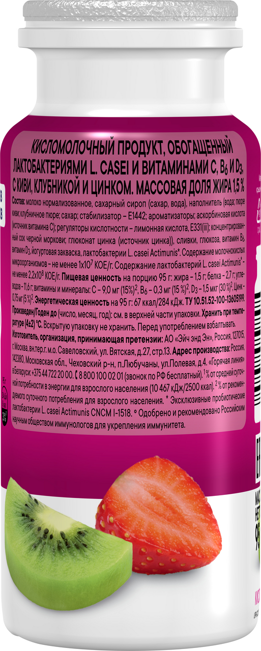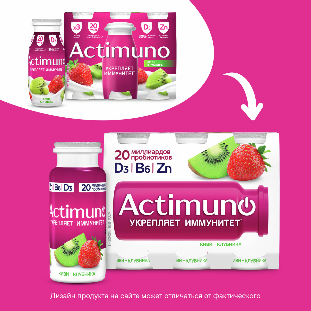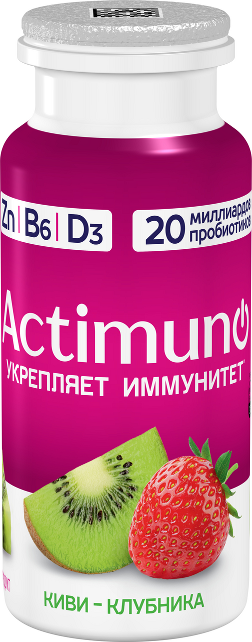 Кисломолочный напиток с оригинальным вкусом киви и клубники — источник пользы для иммунитета. В бутылочке содержится 20 миллиардов бактерий L.Casei Imunitass — живых молочнокислых культур, которые помогают работе иммунитета. Состав кисломолочного напитка также усилен цинком, витаминами В6 и D3. Это обеспечивает дополнительную пользу для здоровья. Actimuno представляет линейку полезных для иммунитета кисломолочных напитков с разнообразными вкусами. Используемое при производстве молоко проходит строжайший контроль качества.
