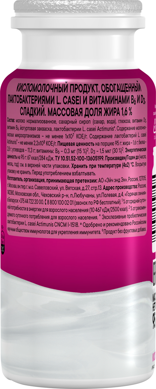 Молоко нормализованное, сахарный сироп (сахар, вода), глюкоза, витамин D3, витамин B6, йогуртовая закваска, лактобактерии L. casei Actimunis*. Содержание молочнокислых микроорганизмов – не менее 1х107 КОЕ/г. Содержание лактобактерий L. сasei Actimunis * – не менее 2,2х108 КОЕ/г.