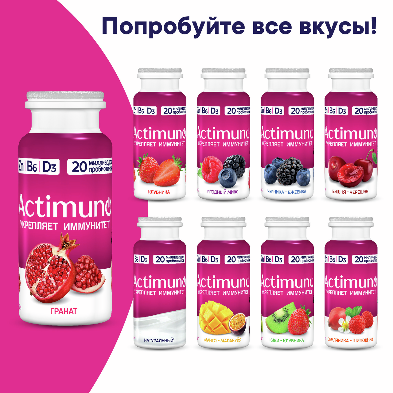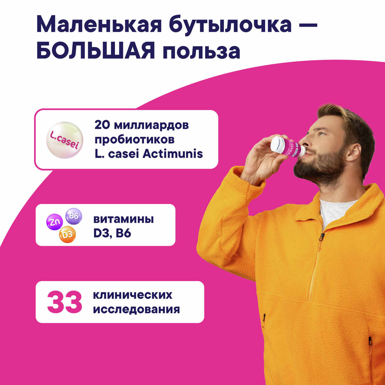 Это один из самых доступных способов ежедневного укрепления иммунитета, ведь в такой маленькой бутылочке содержатся 20 миллиардов пробиотиков L.Casei Imunitass и витамины B6, D3. Всего 2 бутылочки Actimuno в день снижают риск заболеть инфекционным заболеванием на 20% (профилактика общих инфекционных заболеваний).