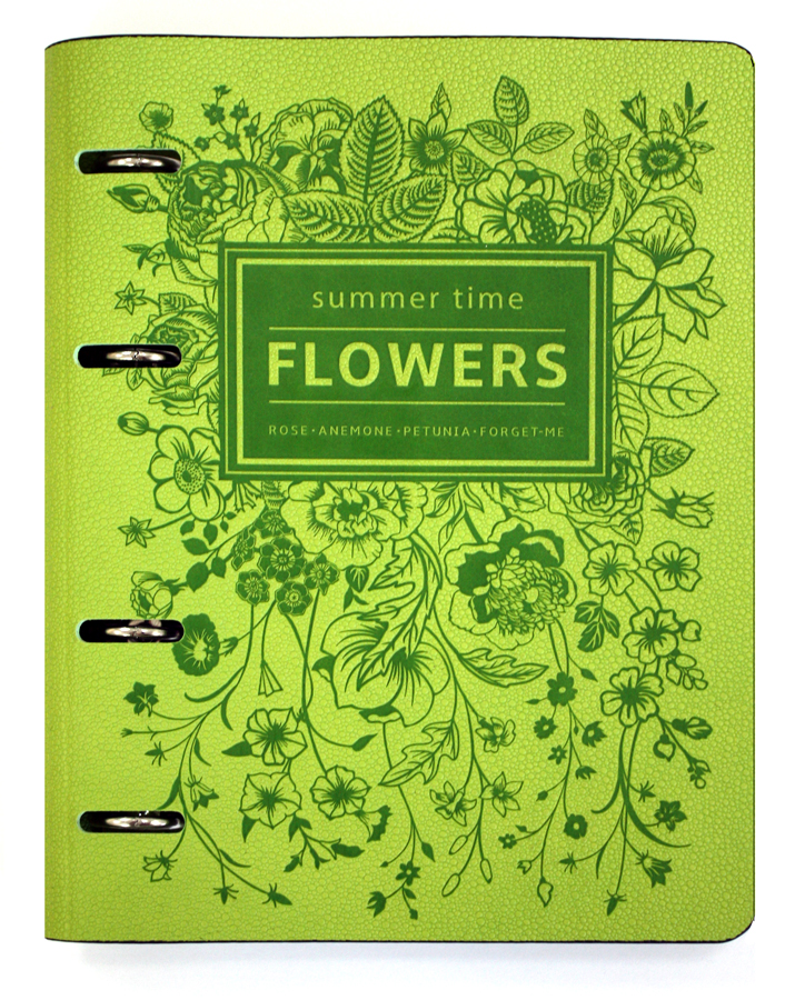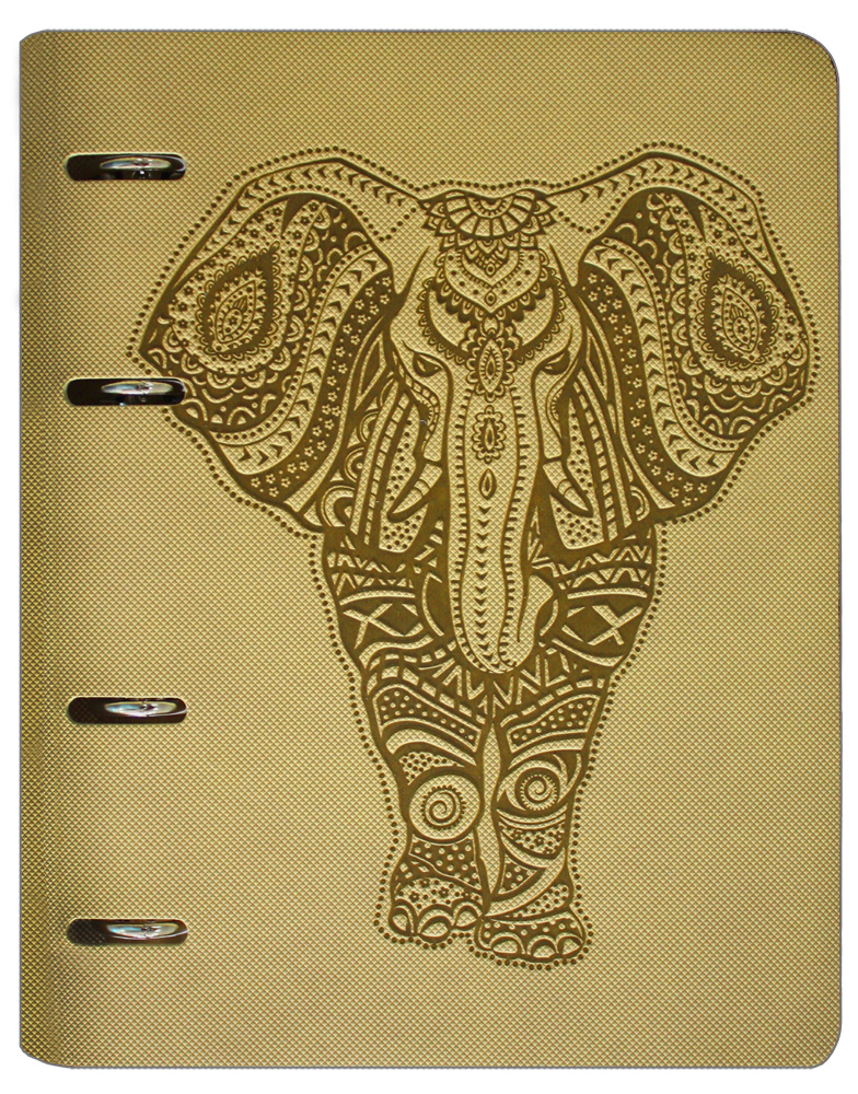 Тетрадь на кольцах представлена в формате А5. Блок — сменный, изготовлен из офсетной бумаги и состоит из 120 листов в клетку. Дизайн обложки — Слон, представлен в единственном виде.