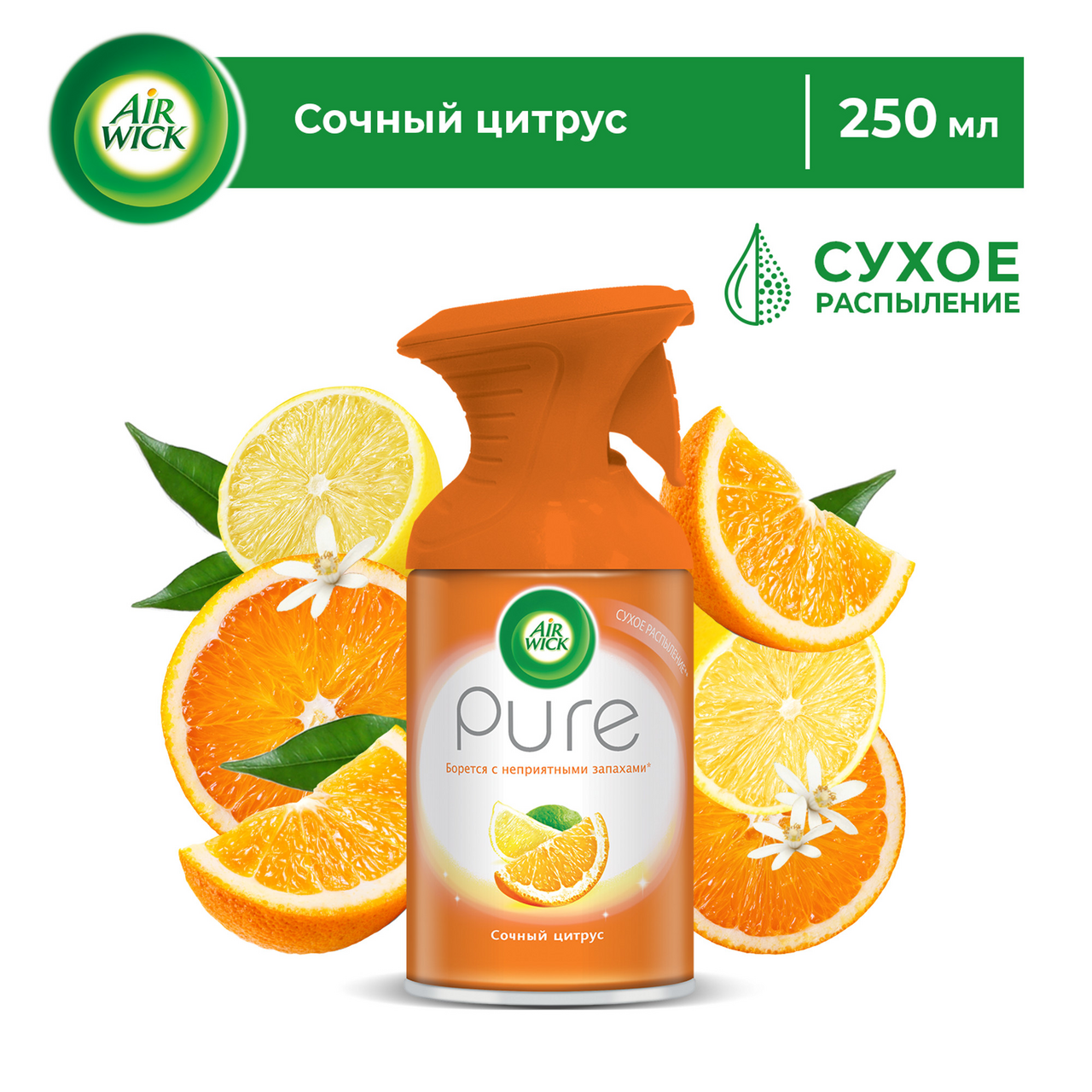 Эффективно борется с неприятными запахами, наполняя дом свежими ароматами цитруса. Благодаря формуле сухого распыления вы сможете насладиться ароматом без мокрых следов на поверхности. Преимущества продукта: до трех раз дольше в использовании, а специальная формула на безводной основе содержит эфирные масла.Обычные аэрозоли содержат воду, которая оседает при распылении и может испортить наслаждение ароматами. Аэрозоли AirWick Pure не содержат воды и дарят чистый аромат без мокрого распыления. Используйте освежители воздуха Air Wick Pure в каждой комнате, наполняя ваш дом свежими и приятными ароматами. Помимо своих уникальных свойств AirWick Pure также обладает яркой, необычной и уникальной упаковкой, которая выделяется на полке своими эргономичной формой и яркими цветами, которые подчеркивают красоту аромата, скрытого в каждом баллоне.