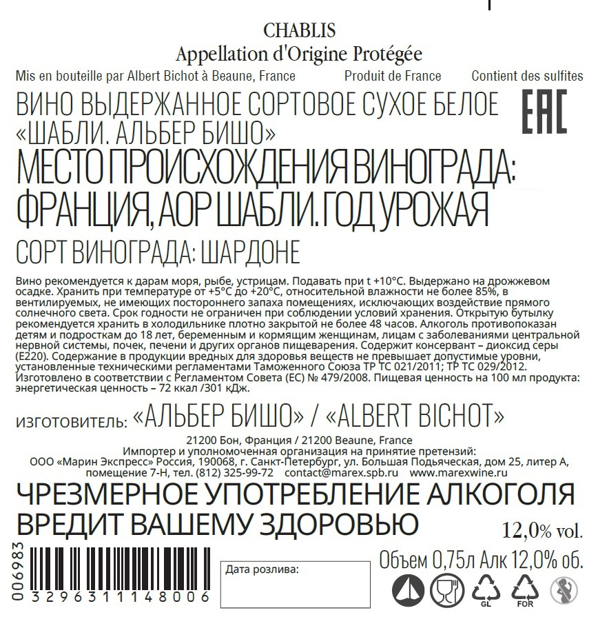 Вино Albert Bichot Chablis белое сухое, 0,75 л обладает интересным, бледно-соломенным цветом с едва заметным зеленоватым оттенком. Такие тона напитку обеспечивает виноград сорта шардоне, который заботливо выращивается Бургундии французскими виноделами. Благодаря их мастерству производится вино с необычными вкусовыми качествами. При откупоривании бутылки явственно ощущается аромат, в котором заметны минеральные и лимонные нотки. Отменные вкусовые качества подчеркивает сбалансированная кислотность. Напиток составит прекрасный тандем с овощами и супами, подчеркнет вкус блюд итальянской кухни, гармонично сочетается с рыбой и различными морепродуктами, подходит к сырам и белому мясу. Рекомендуемая температура подачи +9-11С.