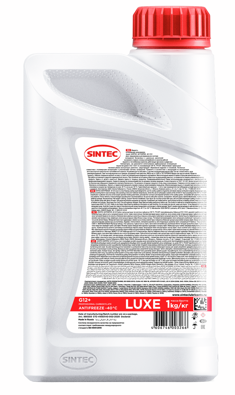 Антифриз Sintec Lux-Oem G12, 1 кг — карбоксилатное охлаждающее вещество нового поколения, созданное с использованием запатентованной технологии органических кислот. Средство свободно от таких канцерогенных соединений, как бораты, фосфаты, силикаты, нитраты и амины. Высококачественная формула класса LUX в полной мере отвечает мировым требованиям VW TL 774-D Type G12. Она допускается к использованию с техникой следующих авторитетных изготовителей транс��орта: АвтоВАЗ и КАМАЗ". Продукт действует нестандартно: впитывается только на местах образования коррозии, не создавая сплошной защитной пленки. Состав отличается долгим сроком эксплуатации, равным 250 тысячам км пробега для легковых машин и 500 тысячам — для грузовых. Данные цифры эквивалентны пяти годам службы. Средство эффективно очищает поверхности, ниши и каналы, препятствуя образованию вредных отложений в труднодоступных зонах. Оно обеспечивает надежную защиту от кавитационной и электрохимической коррозии. Щадящая формула не оказывает разрушающего воздействия на резиновые и полимерные расходные материалы. Продукт превосходно выполняет свою основную функцию: поддержание оптимального температурного режима во внутренних системах автомобильного двигателя без перегрева и замерзания.