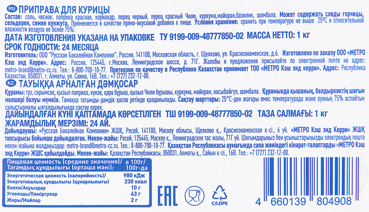 Соль, чеснок, паприка красная, кориандр, перец черный, перец красный Чили, куркума, майоран, базилик, шамбала.
