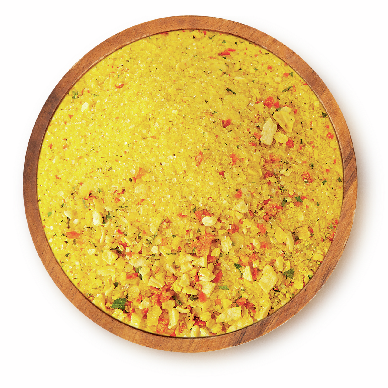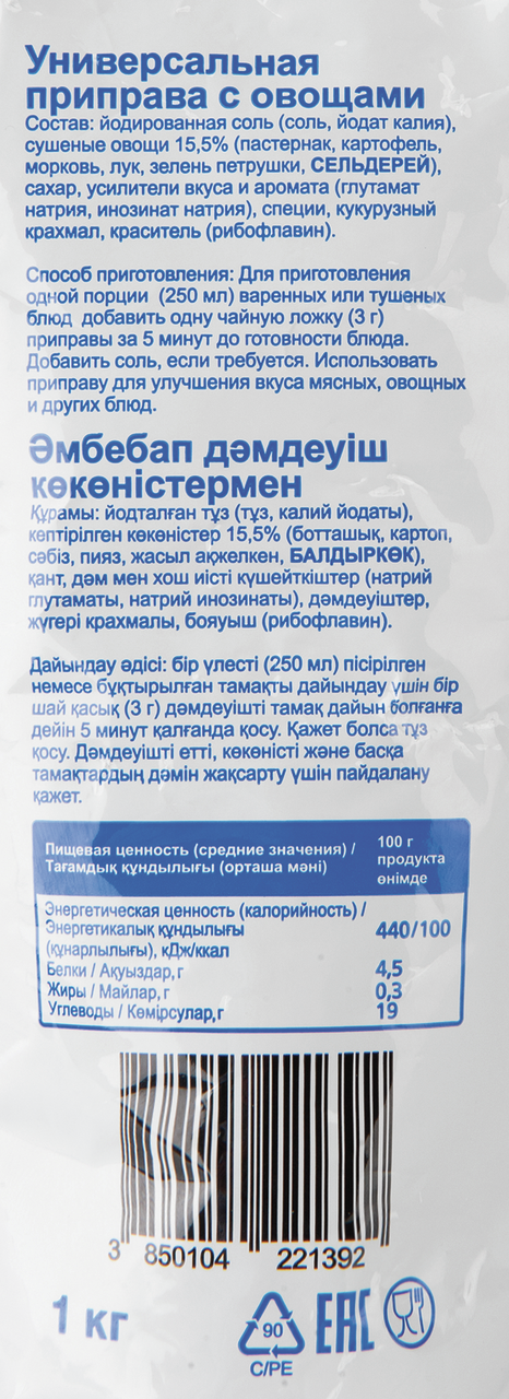 Соль, усилители вкуса и аромата (глутамат натрия, инозинат натрия), сахар, сушеные овощи 10 % (морковь, пастернак, лук, картофель, лист петрушки, сельдерей), кукурузный крахмал, специи, краситель (рибофлавин).