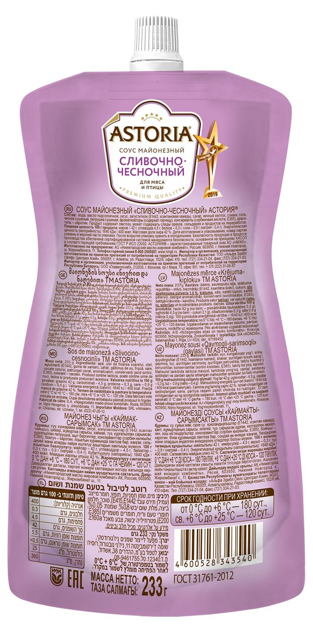 Соус майонезный Astoria Сливочно-чесночный 42%, 233г