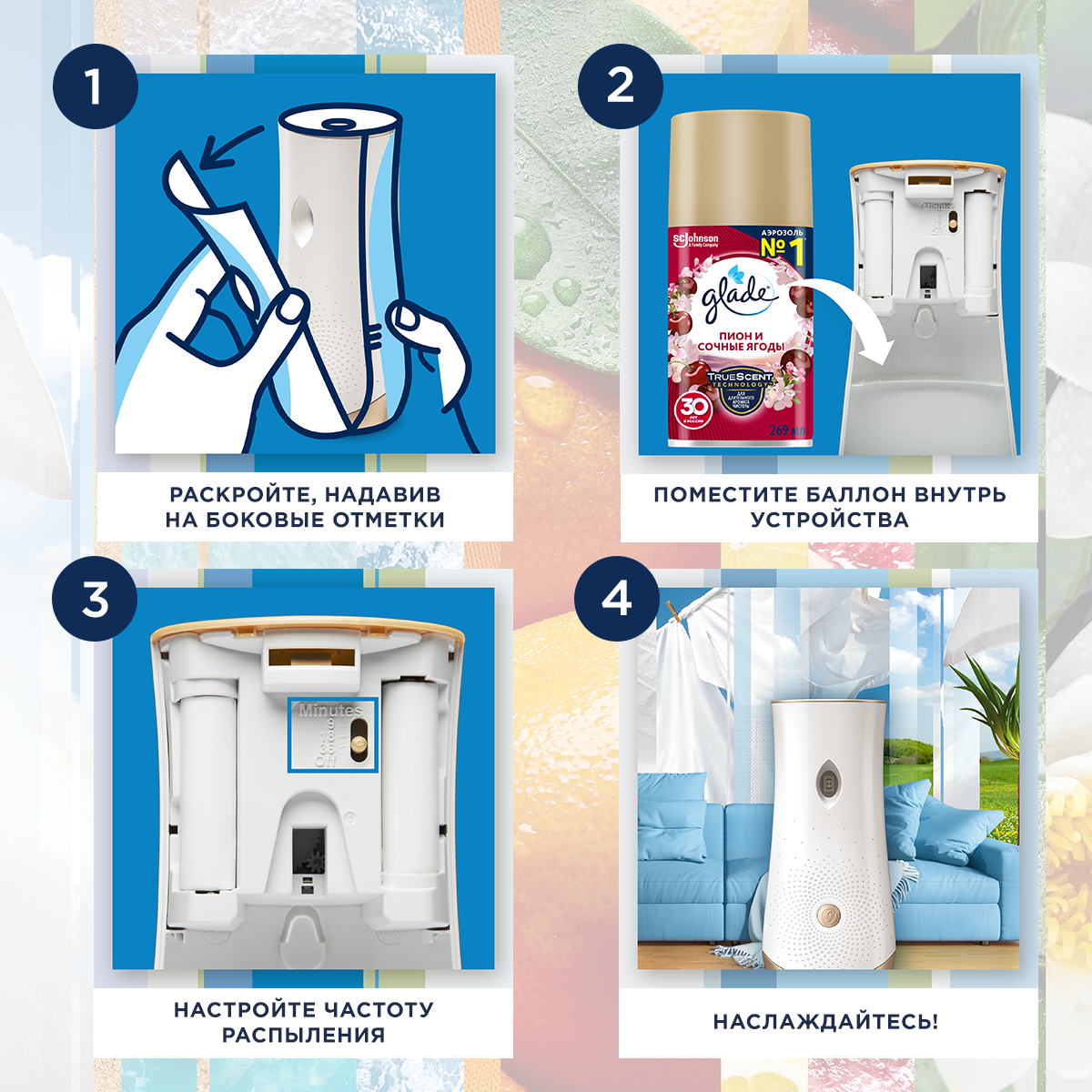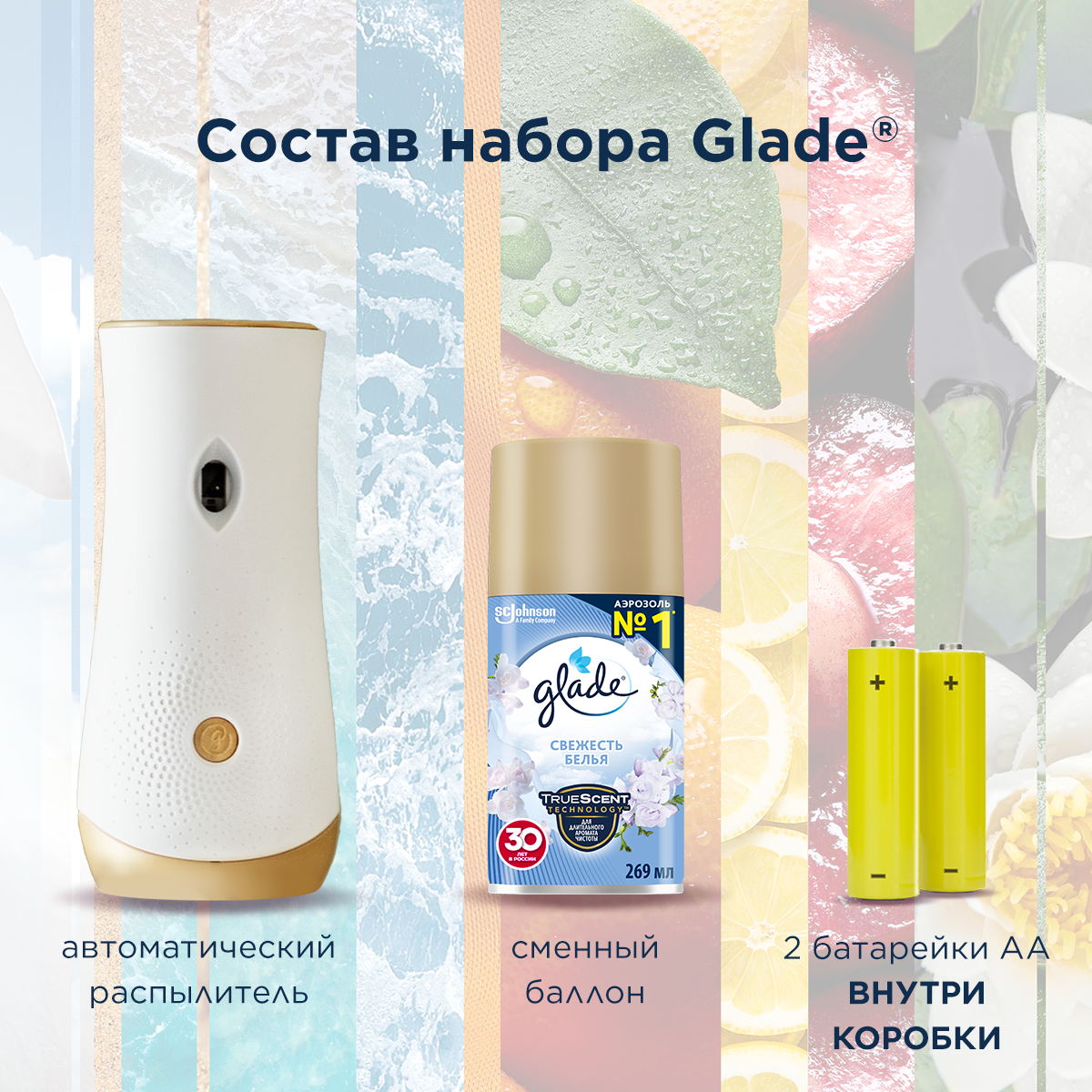 Окружите себя первозданной свежестью. Аромат свежего белья, дополненный современной композицией белых цветов, прохладного воздуха и бодрящих цитрусовых ноток подарит ощущение чистоты Вашему дому. Glade TrueScent Technology гарантирует безопасность и экспертную формулу своих аэрозолей для создания ощущения чистоты.