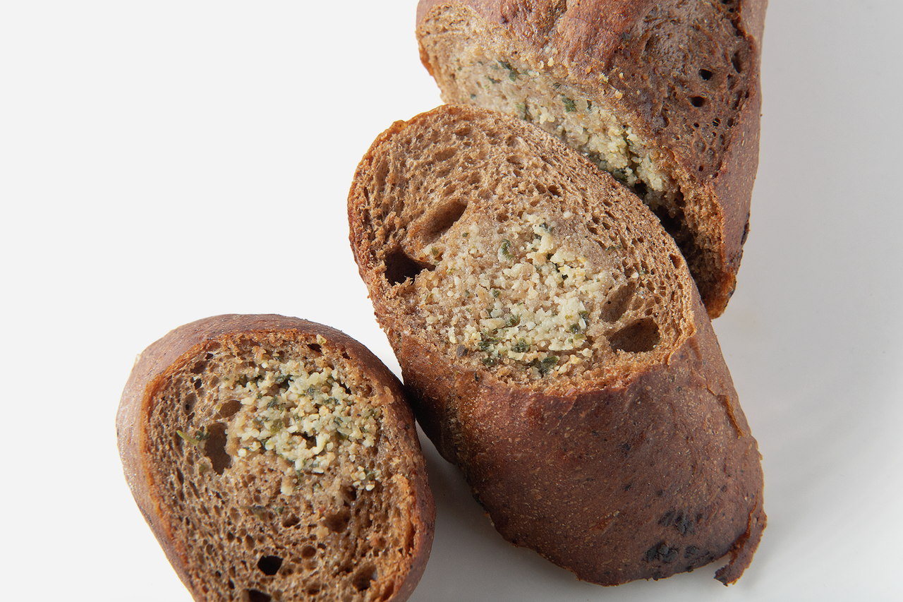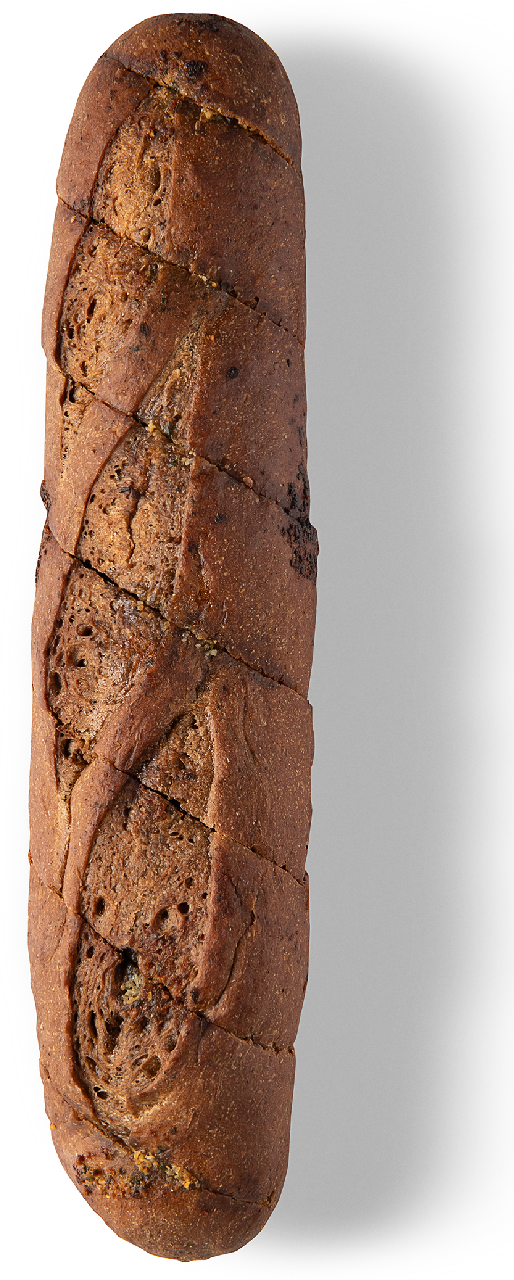 Небольшие хрустящие тёмные багеты с чесночным маслом. Обладают ярким притягательным солодовым ароматом, а чесночная начинка на сливочном масле придаёт багету особый пикантный вкус.Поперечные разрезы позволяют легко разделить его на части.Изготовлен из пшеничной муки высшего сорта. Багет очень прост в приготовлении как в пекарнях и ресторанах, так и в домашних условиях.