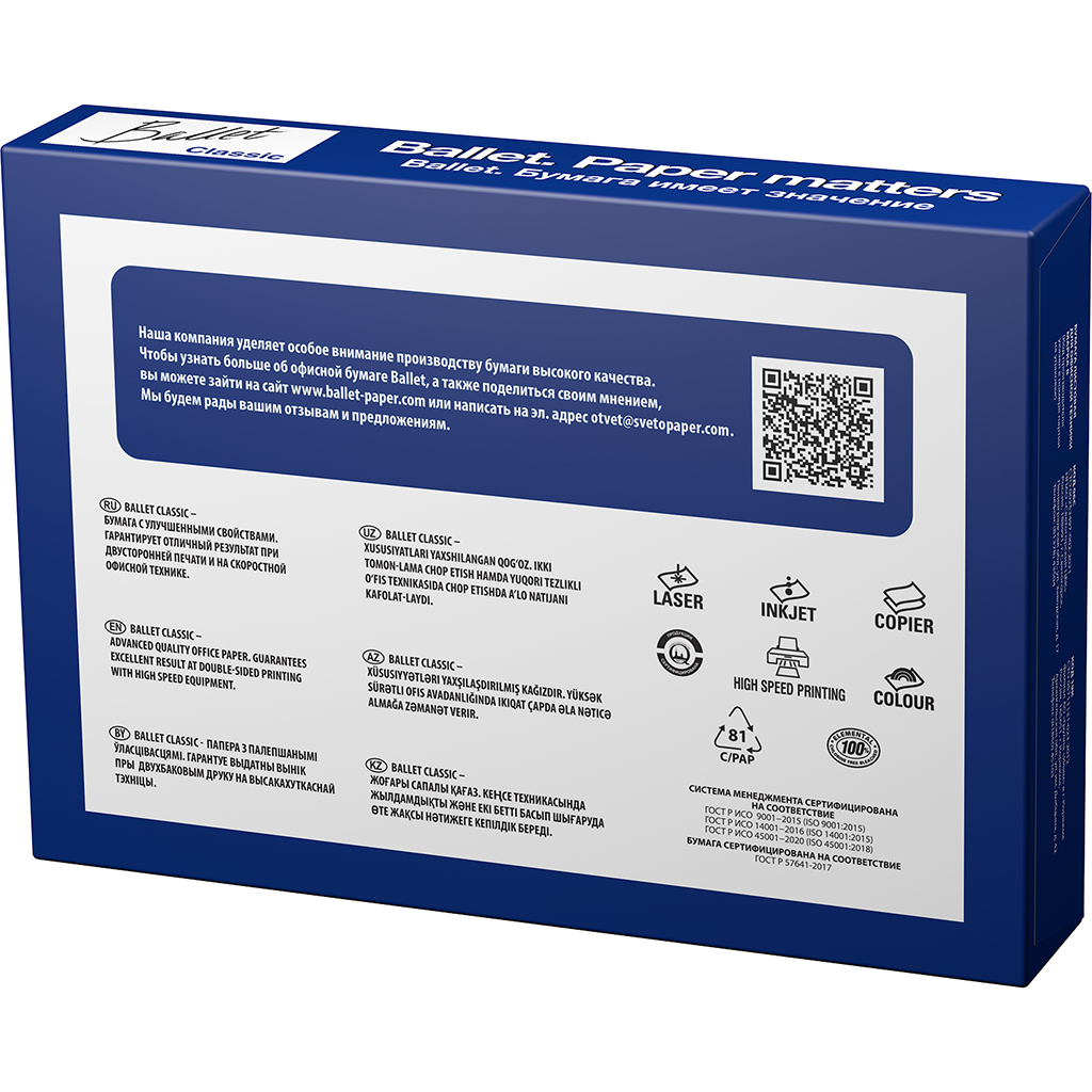Многофункциональная офисная бумага марки B с уникальным на российском рынке пока��ателем белизны 153% (CIE). Идеально подходит для двусторонней печати, не деформируется и не просвечивается. Оптимальная гладкость, непрозрачность и отличные плотностные характеристики гарантируют превосходное качество печати с обеих сторон. Производится с использованием технологии, которая обеспечивает высокую яркость и контрастность печатаемых документов. Бумага соответствует ГОСТ Р 57641-2017. Не содержит хлора. Система менеджмента сертифицирована на соответствие ГОСТ Р ИСО 9001-2015. Ballet Classic это премиальное качество печати по разумной цене. Превратите ваш рабочий документ в настоящий шедевр вместе с офисной бумагой Ballet!