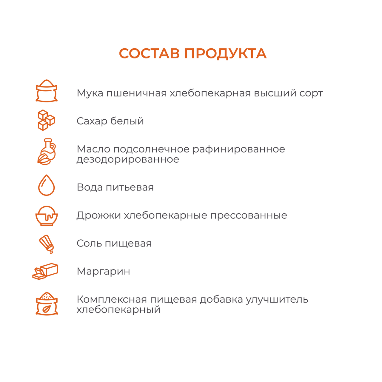 Мука пшеничная хлебопекарная высший сорт, маргарин, сахар, соль поваренная пищевая, дрожжи хлебопекарные прессованные.
