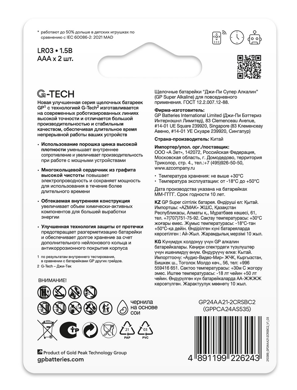 Комплект из двух батареек в блистерной упаковке очень удобно брать с собой в поездки, на дачу, на отдых, чтобы иметь возможность в любой момент обеспечить энергией нужное вам устройство. Алкалиновые батарейки одного из самых популярных в бытовых устройствах форматов, отлично подходят для приборов, рассчитанных на длительный срок работы и нуждающихся в повышенном энергопотреблении: часов, фонариков, будильников, игровых мини-консолей, детских игрушек, компьютерных мышек, пультов дистанционного управления и т. д. Работая на улучшенной марганцево-цинковой системе и щелочном электролите, батареи GP серии Super Alkaline обладают повышенной электроемкостью и длительным сроком хранения.