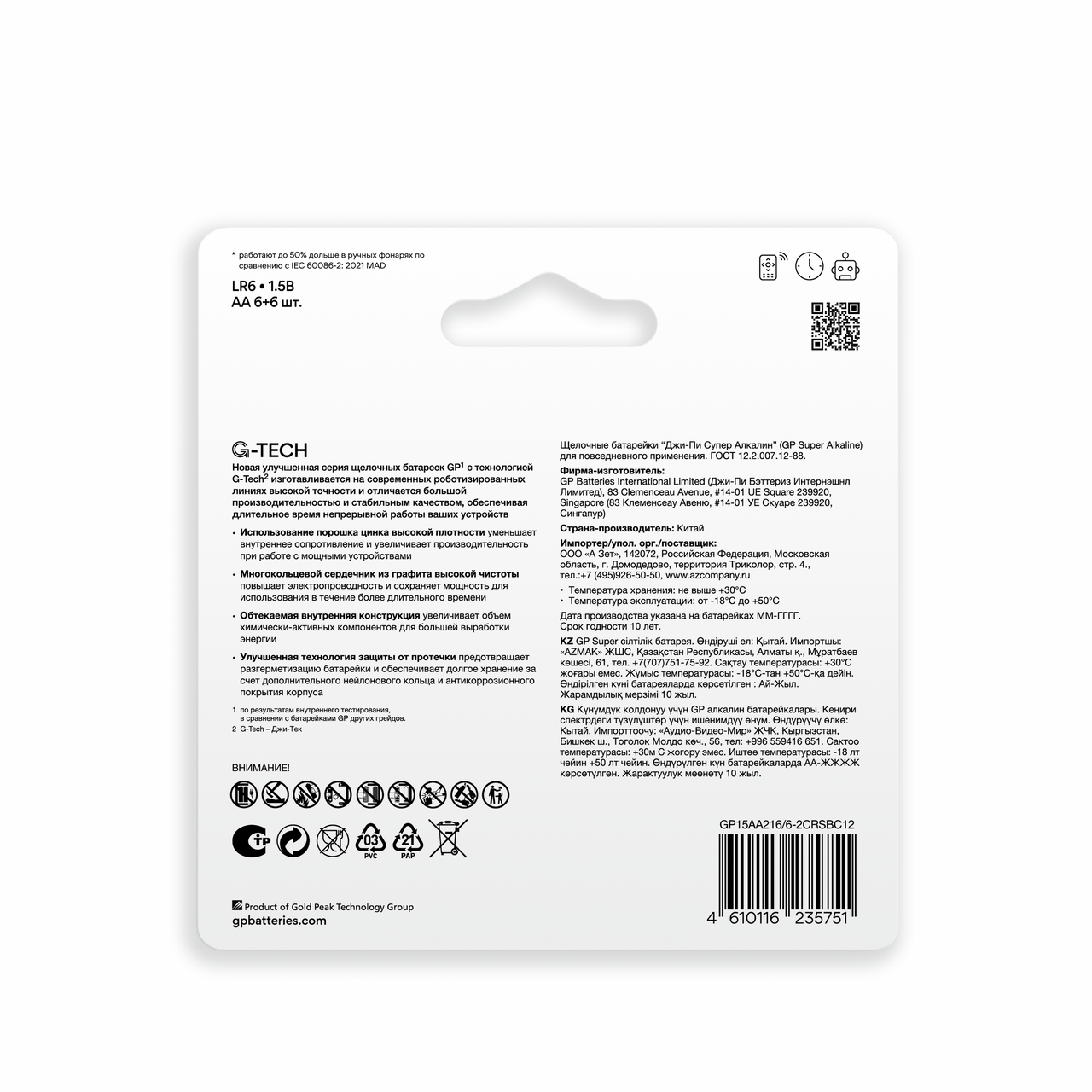 Батарейки GP Super LR6 AA, 12 шт. подходят для различных электронных устройств небольшого размера: пульты дистанционного управления телевизором, портативные цифровые аудиоплееры, карманные радиоприемники, фотоаппараты и другие беспроводные гаджеты. Батарейки изготовлены по новой формуле для более надежной и продолжительной работы устройств с высоким потреблением энергии. Щелочные или алкалиновые батарейки обладают электрической емкостью в несколько раз большей, чем солевые, а также более высокой мощностью, что очень важно для работы устройств в полную силу.