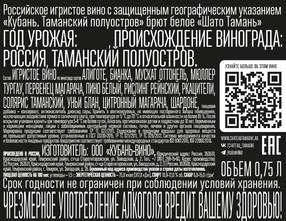 Игристое вино Chateau Tamagne белое брют, 0,75 л демонстрирует изысканный вкус, с хорошим балансом кислотности, мягкий, свежий, с некоторой терпкостью и пряными нюансами. Послевкусие продолжительное, приятное. Вино произведено в Краснодарском крае, Россия, из винограда сортов Шардоне, Траминер, Совиньон Блан и других белых сортов. Крепость напитка 13%. Цвет вина чистый, прозрачный, изменяет гамму оттенков от светло-соломенного до зеленоватого и золотистого, красиво переливаясь в бокале. Картину дополняет долгая и стройная игра пузырьков. Аромат гармоничный, развитый, преимущественно с цветочными тонами, также ощущаются оттенки луговых трав и цитрусовых. Напиток замечателен в качестве аперитива. По отношению к закускам - универсален. Может быть подан к мясу, птице, рыбе, морепродуктам, моллюскам. Достойно подчеркнут вкус напитка икра, миндаль, колбасные деликатесы, неострые сыры. Подойдет для сопровождения десертов – выпечки, сливочно-кремовых десертов, конфет, фруктов, ягод, мороженого. Сервировать рекомендуется значительно охлажденным до температуры 6-8С. В производстве игристого Брют используется отборный виноград, выращенный на Таманском полуострове, омываемом водами Черного и Азовского морей, с благоприятным микроклиматом и плодородными почвами. Сусло проходит охлаждение мезги и кратковременную настойку в прессах, применяется периодическая флотация. Изготавливаются с применением резервуарного метода Шарма. При этом процесс брожения производится в больших емкостях, акратофорах, позволяя продуцировать крупные партии вин с устойчивыми характеристиками вкуса и аромата.