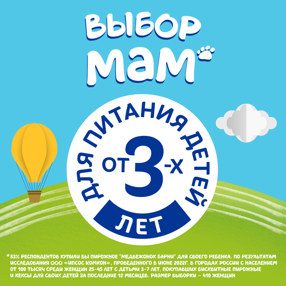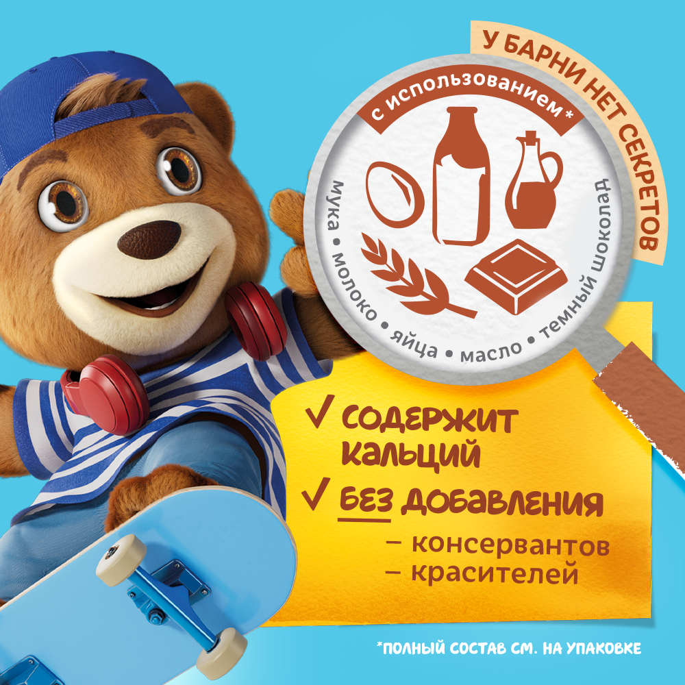 Пирожное бисквитное Медвежонок Барни Фан Сэндвич с измельченным печеньем "Oreo" и с начинкой с кусочками темного шоколада - специально разработанное для детей кондитерское изделие в виде бисквитного сэндвича с начинкой, производится на основе натуральных ингредиентов: злаков и молочных продуктов. Рекомендовано для детей дошкольного возраста от 3х лет, а также придется по вкусу детям младшего и среднего школьного возраста. Благодаря веселым мордочкам на каждом бисквите, этот вкусный, полезный и питательный перекус подарит заряд бодрости и хорошего настроения на целый день. Он отлично сочетается с соком, молоком, кефиром, чаем или какао, его удобно брать с собой в дорогу, давать ребенку в школу или на прогулку. Это прекрасный вариант сладкого угощения на детский праздник в школу, на День рождения. В коробке шесть пирожных. Бисквитный сэндвич Барни - это выбор мам, 83% мам купили бы этот вкусный десерт для своего ребенка*.*По результатам исследования ООО "Ипсос Комкон", проведенного в июне 2022г в городах России с населением от 100 тысяч среди женщин25-45 лет с детьми 3-7, покупавших бисквитные пирожные и кексы для своих детей за последние 12 мес.