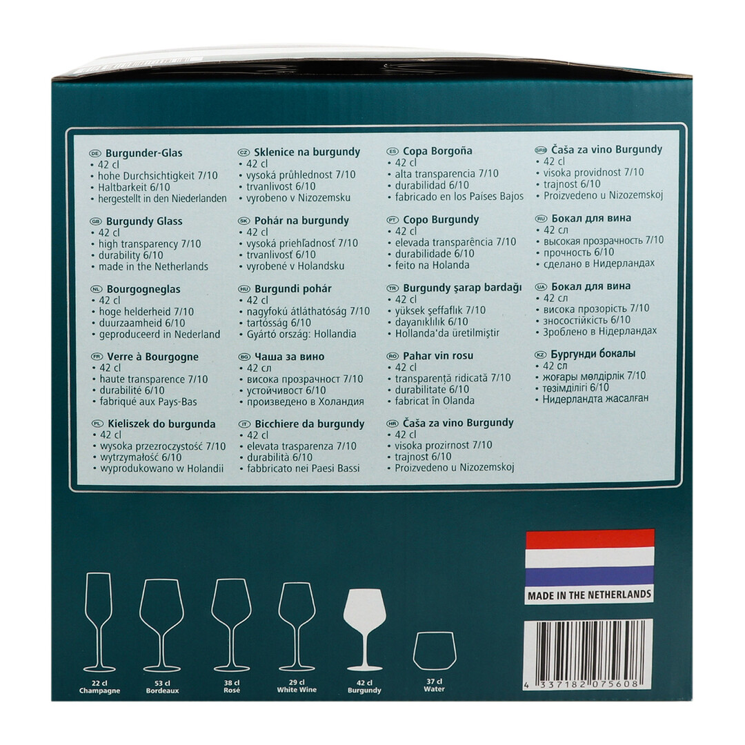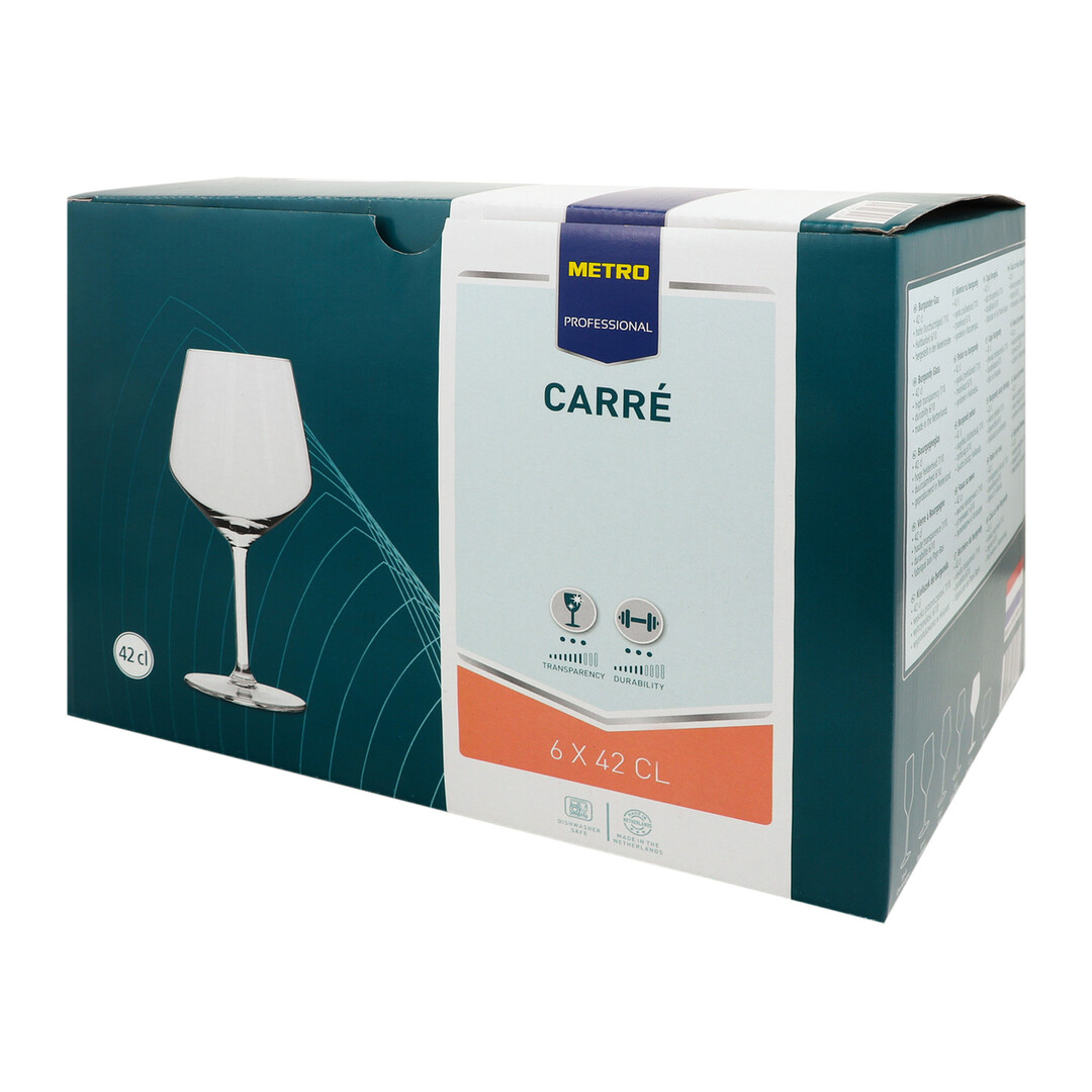 METRO PROFESSIONAL Набор бокалов для красного вина Carree, 420 мл х 6 шт. — незаменимый аксессуар для сервировки праздничного стола. Стеклянная посуда отличается особой легкостью, по сравнению с хрустальными аналогами. Винные стеклянные бокалы предназначены для охлажденных напитков. Мыть их следует теплой водой с обычным моющим средством для посуды. При ополаскивании неплохо добавить в воду смесь соли и лимонного сока, что придаст стеклу сияющий блеск и непревзойденную прозрачность. После мытья изделия необходимо насухо протереть мягким полотенцем, во избежание образования мутных подтеков. Можно их помыть в посудомоечной машине. Бокалы имеют высокую зауженную форму, напоминающую тюльпан. Тонкая длинная ножка позволяет с комфортом удерживать бокал в руке, она же не дает содержимому слишком быстро нагреваться от тепла ладоней, что очень важно для белого вина, которое лучше всего пить охлажденным. Не меньшее значение в эстетике подачи напитка имеет и небольшой объем бокала, чем меньше в нем вина, тем меньше оно нагревается. Бокалы тюльпановидной формы изготовлены из стекла. Этот изысканный в своей простоте материал смотрится очень эффектно и утонченно. Он обладает достаточной прочностью, не склонен к растрескиванию и ломкости, поэтому отлично подходит для продолжительной эксплуатации. Гигиеничность и экологичность делает его абсолютно безопасным для здоровья человека и удобным в использовании.