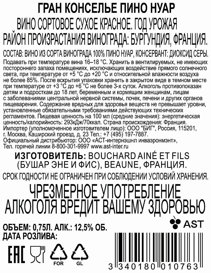 Вино Bouchard Aine & Fils Grand Conseiller Pinot Noir красное сухое, 0.75л производится во Франции из винограда сорта Пино Нуар. Урожай собирается при достижении оптимального уровня зрелости. Напиток изготавливается по классической технологии, напиток ферментируется в стальных резервуарах, после чего выдерживается 6 месяцев в дубовых бочках. В результате вино приобретает насыщенный рубиновый цвет, при искусственном и естественном освещении искрится гранатовыми бликами. Напиток обладает ароматом ежевики, сливы, граната, присутствуют древесные мотивы, а также отголоски душистых пряностей и табака. Во вкусе ощущаются спелые фрукты. Послевкусие яркое и длительно, угасает постепенно, бархатные танины сбалансированы легкой кислотностью. Вино гармонично сочетается с овощами, приготовленными на гриле, стейками, барбекю, шашлыком, горячими закусками, салатами, пастой. Допускается сервировать сырной тарелкой, состоящей из пикантных и выдержанных сортов, копченостями и деликатесными колбасами. К столу подавать охлажденным до 16-18 градусов, после вскрытия бутылки, вино необходимо оставить на 15 минут, чтобы оно подышало.