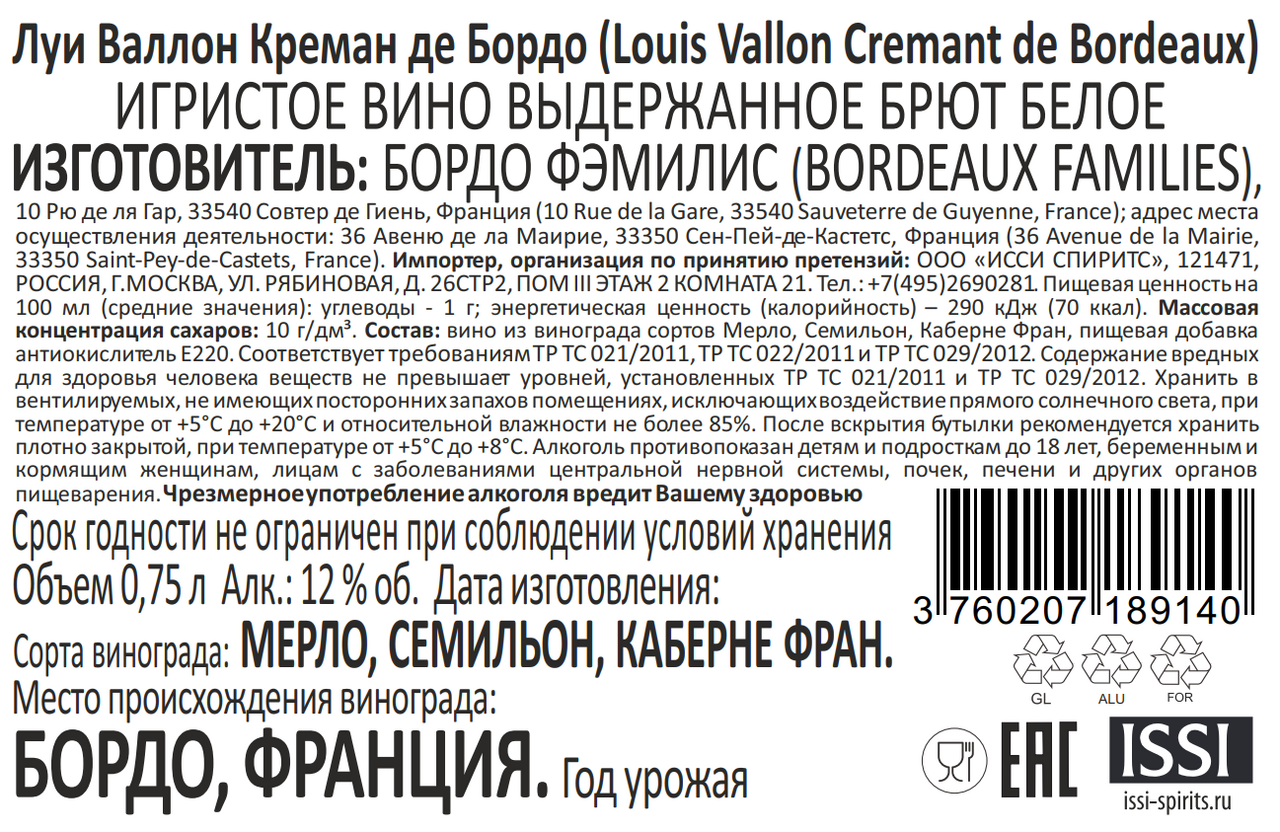 Вино игристое Louis Vallon Cremant de Bordeaux AOC Brut белое брют, 0.75л бледно-желтого цвета с легкими зеленоватыми отражениями и тонким перляжем обладает освежающим ароматом, сотканным из нот белых цветов и фруктов. Игристое вино демонстрирует мягкий, чистый, изысканный вкус с нотами спелых фруктов, утонченной кислинкой и долгим послевкусием с минерально-хлебными нюансами. Вино рекомендуется сервировать с десертами, легкими закусками либо в качестве аперитива.