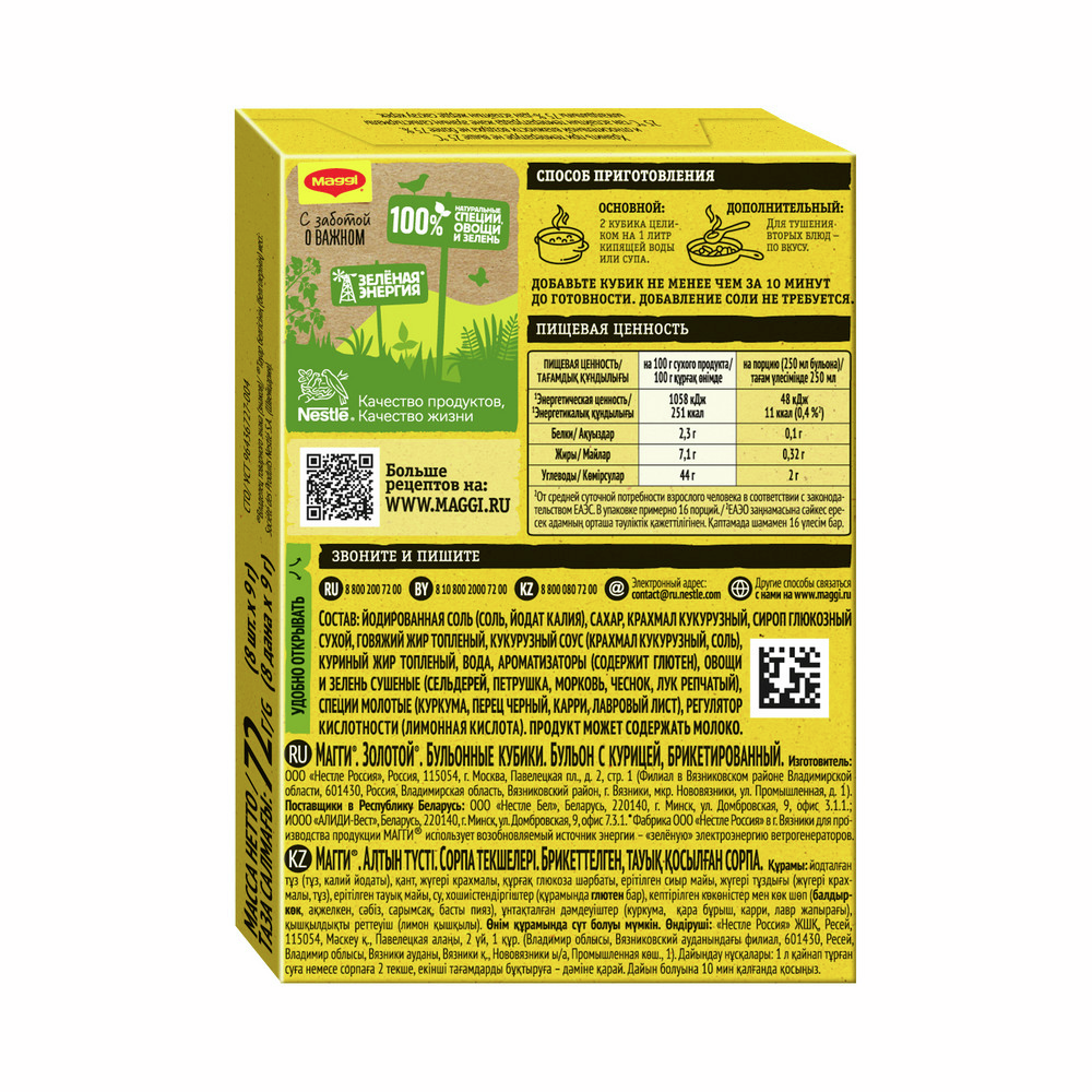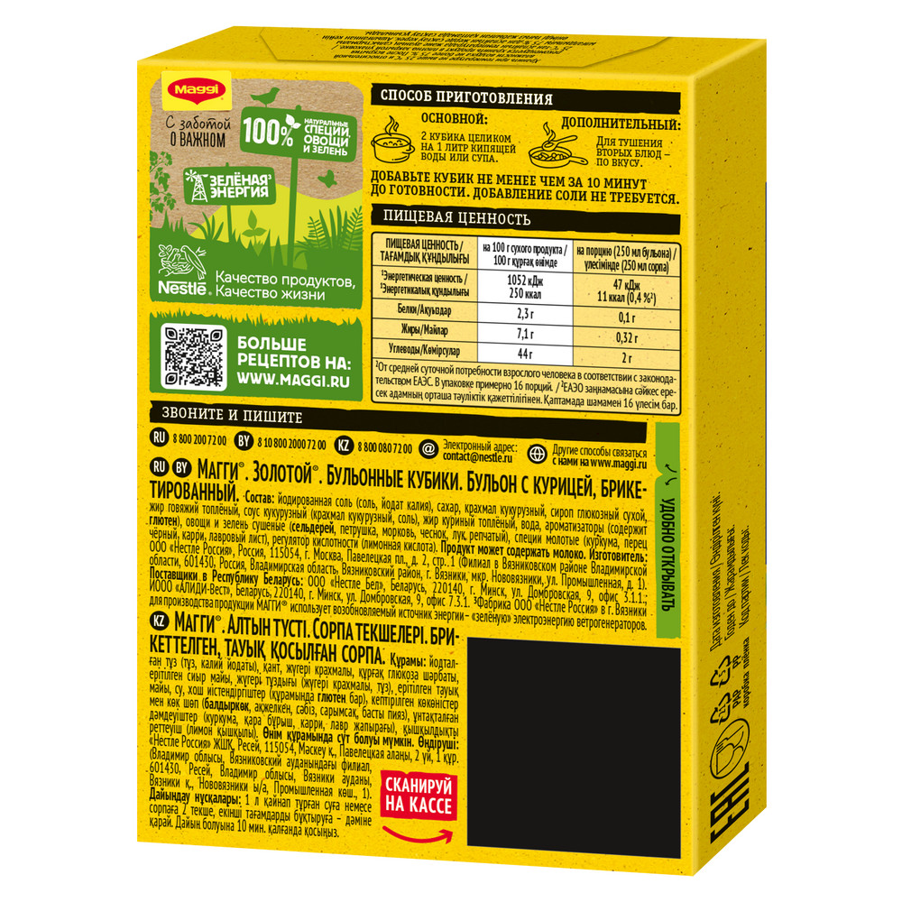Это быстрый и простой способ приготовить домашний куриный суп для всей семьи. В каждом кубике идеально сочетаются букет специй, овощей, трав и соль. Благодаря Maggi бульон приобретает насыщенный куриный вкус и золотистый цвет. Чтобы приготовить вкусный куриный бульон, добавьте 2 кубика Maggi на 1 литр кипящей воды или супа не менее чем за 5 минут до готовности. Продукт содержит натуральные овощи и зелень - сельдерей, петрушку, морковь, чеснок и лук, а также смесь молотых специй, которые придают блюду яркий вкус и аромат. С куриным кубиком Maggi Золотой вы можете приготовить не только домашний бульон, но и другие блюда. Например, рассыпчатый рис, который благодаря бульону приобретет яркий цвет. Такой ароматный гарнир идеально дополнит рыбу или мясо.