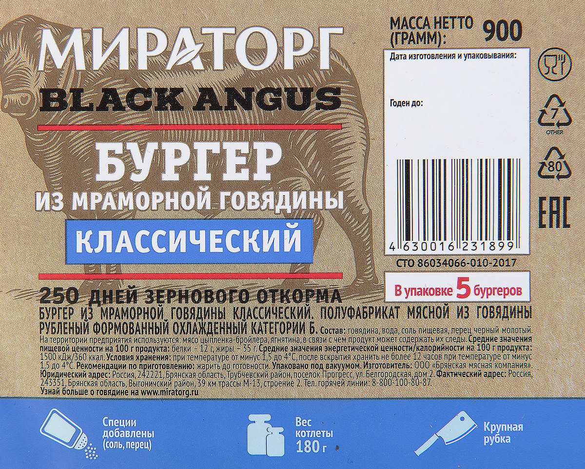 Бургер Классический Мираторг, 900 г – хороший выбор для быстрого перекуса или полноценного обеда и ужина. Это большой и сочный бургер, который приготовлен из мраморной говядины, дополненной смесью разных специй. Химический состав этого вида мяса богат витаминами и минеральными веществами, необходимыми для человеческого организма – это калий, кальций, железо, магний, йод и многое другое. В готовом виде классический бургер имеет приятный аромат и насыщенный вкус. При необходимости вы можете дополнить его ломтиками маринованного огурца, кольцами репчатого лука и томатным кетчупом. Чувство сытости после такого бургера будет присутствовать довольно долго.