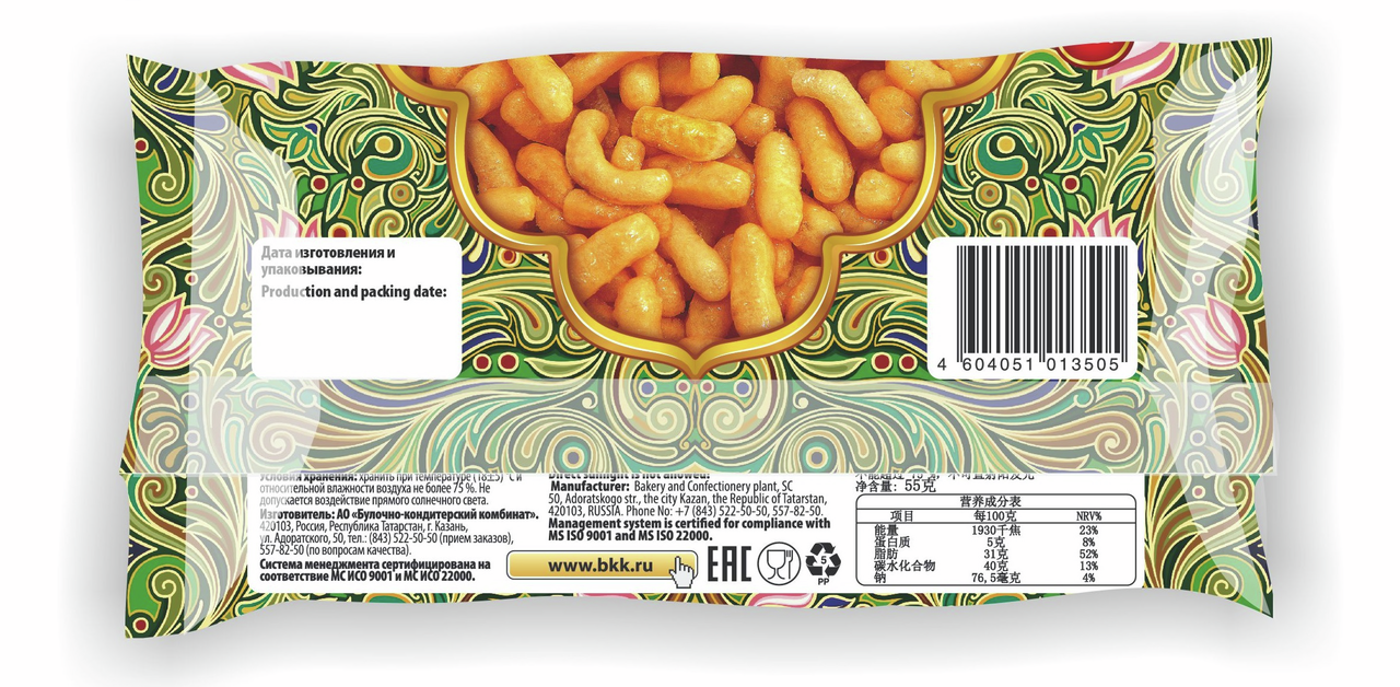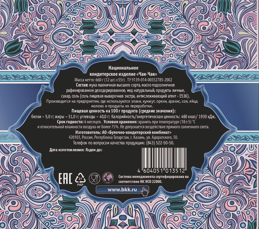 Кондитерское изделие БКК Чак-чак, 55 г — национальное лакомство тюркских народов, от которого придут в восторг как взрослые, так и маленькие гурманы. Сейчас чак-чак – волне привычное блюдо. Раньше же его готовили только по большим праздникам и дарили на свадьбу. Привычным делом было, когда родители молодых, приходя в гости друг к другу, в качестве угощения приносили с собой это удивительно вкусное лакомство. Готовится чак-чак из мягкого теста в форме небольших палочек. Они обжариваются в масле до румяной корочки, а после обильно покрываются густой заливкой на основе меда. Выкладывают продукт в виде горки. Изысканное и нежное лакомство прекрасно сочетается с горячими напитками — ароматным чаем и бодрящим кофе. Его можно подать к повседневному и праздничн��му столу, взять с собой в гости и в офис, чтобы угостить коллег. Состав чак-чака натуральный и безопасный. В него входят: пшеничная мука, яйца, масло, мед и другие компоненты. Десерт очень сытный и питательный. Богатый углеводами, он легко восстановит силы, зарядит энергией и подарит массу положительных эмоций! В умеренном количестве продукт не прибавит лишних килограммов!