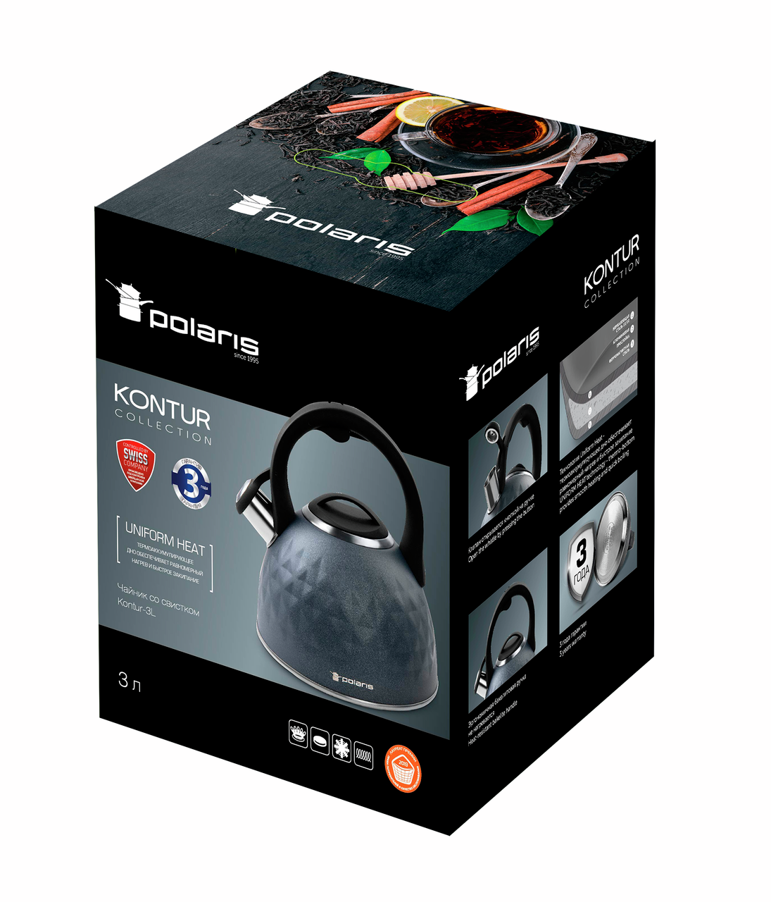 Чайник со свистком Polaris Kontur, нержавеющая сталь, 3 л — идеальный подарок к любому празднику. Его лаконичный внешний вид гармонично вписывается в любой интерьер кухни: лофт, классика, хай-тек, модерн. Он выполнен из ударопрочной нержавеющей стали 18/10, которая противостоит высоким температурам, не портится под воздействием влаги, пыли, ультрафиолета. Также материал устойчив к коррозии и механическим нагрузкам. Он надолго сохраняет первоначальные характеристики, цвет, форму. Модель объемом 3 л подходит для кипячения воды для большой семьи. Ее конструкция получила технологию UNIFORM HEAT с термоаккумулирующим дном. Она обеспечивает равномерный нагрев и быстрое закипание. С помощью такого чайника можно кипятить воду для чая, какао, кофе, травяных сборов и другого. Благодаря громкому свистку услышать о готовности к чайной церемонии или завтраку можно даже из соседней комнаты. Специальный клапан открывается при помощи кнопки на ручке с удобным хватом. Можно не переживать, что чайник нечаянно выскользнет из рук, так как бакелитовая ручка не нагревается и абсолютно безопасна в использовании. Гладкие стенки прибора обеспечивают легкость в уходе и сохраняют эстетический вид на протяжении длительного времени. Важной особенностью конструкции Polaris Kontur стало наличие системы защиты от перегрева и функция автоматического отключения при достижении определенной температуры. Это повышает безопасность эксплуатации и предотвращает возможные аварийные ситуации.