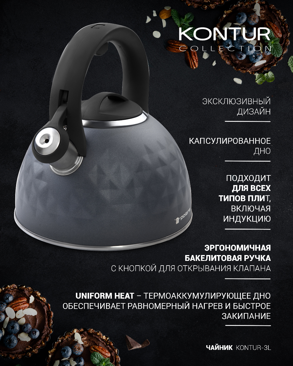 Чайник со свистком Polaris Kontur 3L нержавеющая сталь, 3л