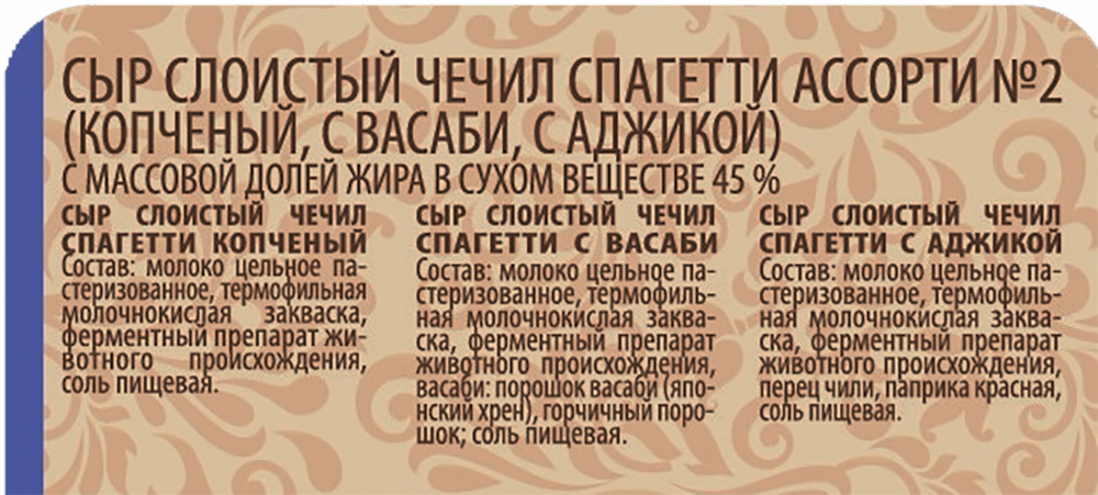 Сыр Чечил спагетти Ассорти №2 Долголетие 45%, 150г завоевал любовь гурманов. В одной упаковкетри уникальных вкуса. Сыр изготавливают с добавкой васаби и острой кавказкой аджики в виде соломки. Такой вариант поможет каждому найти свой продукт. Компактную упаковку удобно брать в дорогу. Это отличный вариант для пикника. Сыр Чечил спагетти Ассорти No2 бренда Долголетие является великолепной закуской и полноценным перекусом благодаря пищевым свойствам и полезным компонентам в составе. Продукт понравится большой компании, потому что каждый сможет выбрать сыр на свой вкус!