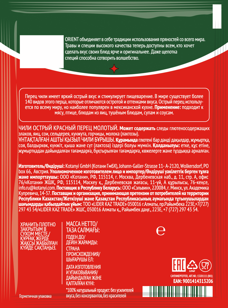 Чили молотый Orient, 12г представляет собой пряность, которая изготовлена из горьких сортов стручкового перца. Она отличается пикантным, ярким вкусом и аппетитным ароматом, что помогает придать блюду особую изюминку. В состав входят различные витамины и минералы, которые оказывают положительное воздействие на организм человека. Специя стимулирует работу желудочно-кишечного тракта. Она идеально сочетается с базиликом, кориандром, чесноком, лавровым листом. Отлично подходит к различным блюдам из яиц, птицы, рыбы, супов, говядины. Пряность можно использовать в производстве колбас, мясных и овощных консервов. Она может стать основой для острых соусов – Табаско, Харисса.