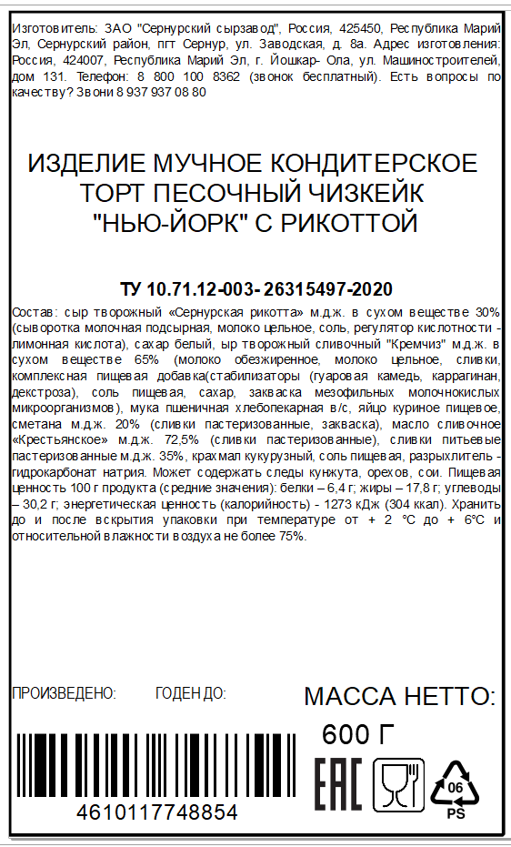 Сыр творожный Сернурская рикотта м.д.ж в сухом веществе 30% (сыворотка молочная подсырная, молоко цельное, соль, регулятор кислотности - лимонная кислота), сахар белый, сыр творожный сливочный "Кремчиз" м.д.ж. в сухом веществе 65% (молоко обезжиренное, молоко цельное, сливки, комплексная пищевая добавка, стабилизаторы (гуаровая камедь, каррагинан декстроза), соль пищевая, сахар, закваска мезофильных молочнокислых микроорганизмов), мука пшеничная хлебопекарная в/с, яйцо куриное пищевое сметана м.д.ж. 20% (сливки пастеризованные, закваска), масло сливочное Крестьянское м.д.ж. 72,5% (сливки пастеризованные), сливки питьевые пастеризованные мдж. 35%, крахмал кукурузный, соль пищевая, разрыхлитель - гидрокарбонат натрия.