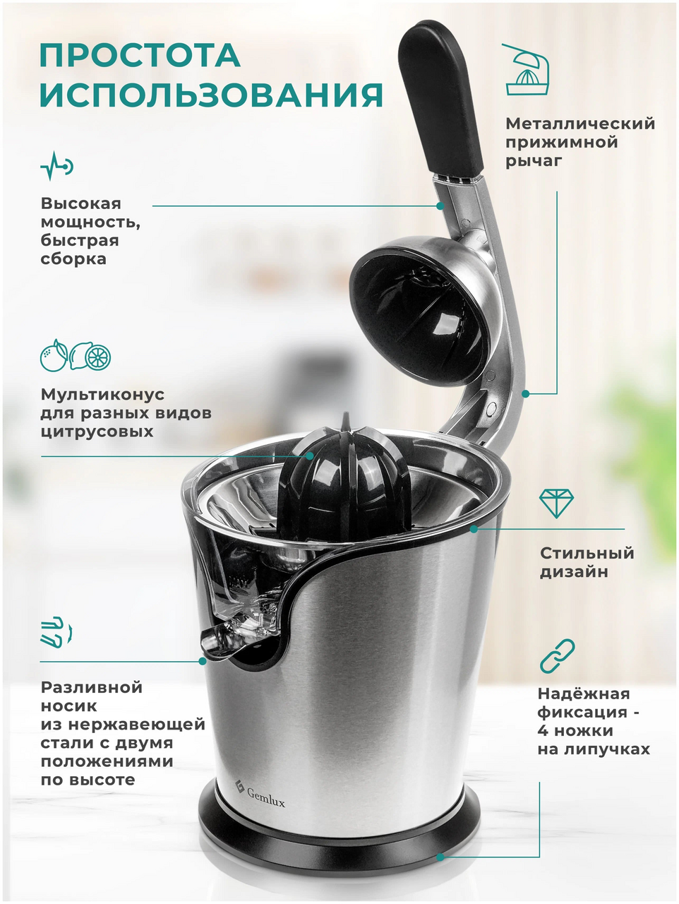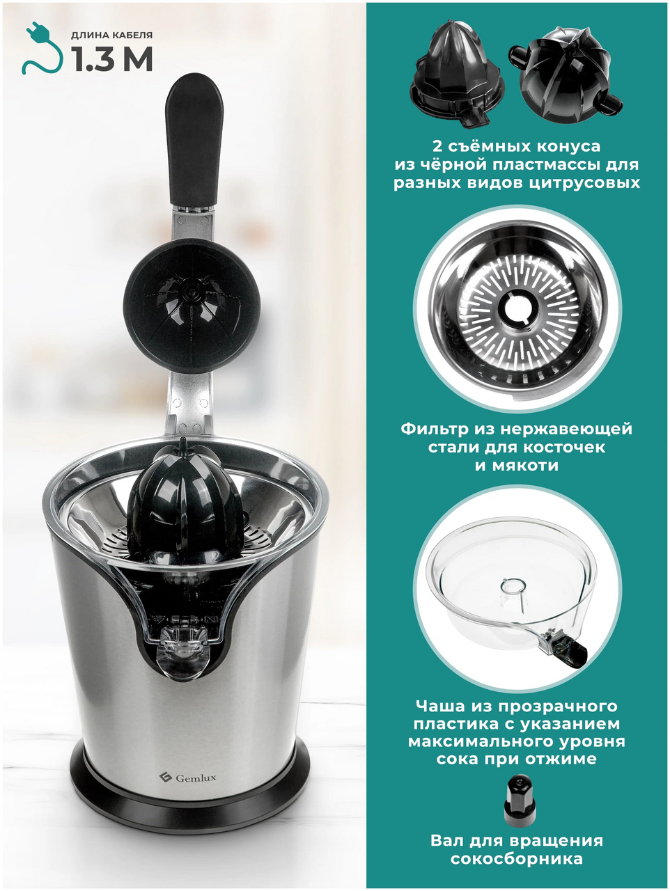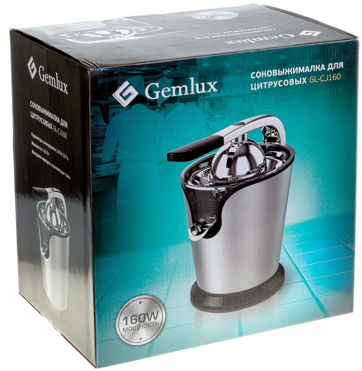 Соковыжималка для цитрусовых Gemlux GL-CJ160 – универсальное устройство, которое непременно найдет свое применение не только на домашней кухне у любителей цитрусовых фрешей, но и в небольших барах и кафе. Оборудование имеет прочный гигиеничный корпус из нержавеющей стали с элементами черной пластмассы, за счет чего данная модель смотрится стильно и профессионально на любой кухне. В комплект соковыжималки Gemlux GL-CJ160 входят: — чаша из прозрачного пластика с указанием максимального уровня сока при отжиме, — фильтр из нержавеющей стали для косточек и мякоти, — два съемных конуса из черной пластмассы для разных видов цитрусовых. Двигатель мощностью 160 Вт (а это высокая мощность для цитрусовых соковыжималок!) и металлический прижимной рычаг позволят вам без особых усилий выжать сок из любых цитрусовых: лимонов, лаймов, апельсинов, грейпфрутов и т. п. Достаточно лишь помыть фрукты и разрезать их пополам. В данной модели предусмотрена прямая подача сока из чаши в стакан. Для этой цели чаша оснащена носиком из нержавеющей стали, который имеет два положения по высоте: верхнее используется в процессе отжима (сок не выливается и накапливается в чаше), нижнее – для розлива. Режим работы соковыжималки Gemlux GL-CJ160 – периодический (повторно кратковременный): после нескольких минут работы необходимо выдержать технологическую паузу для охлаждения двигателя.