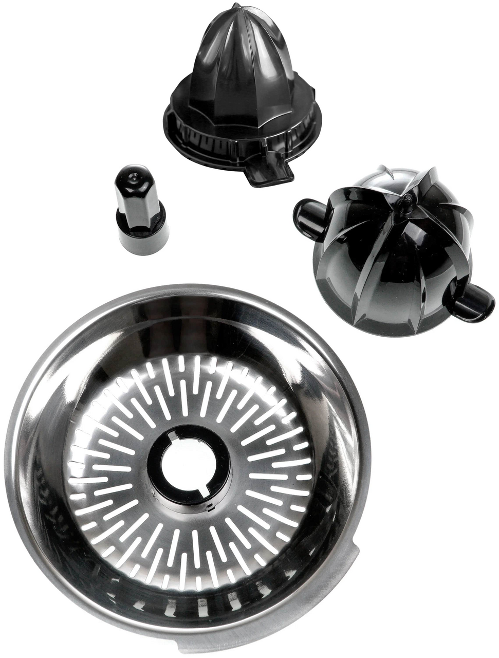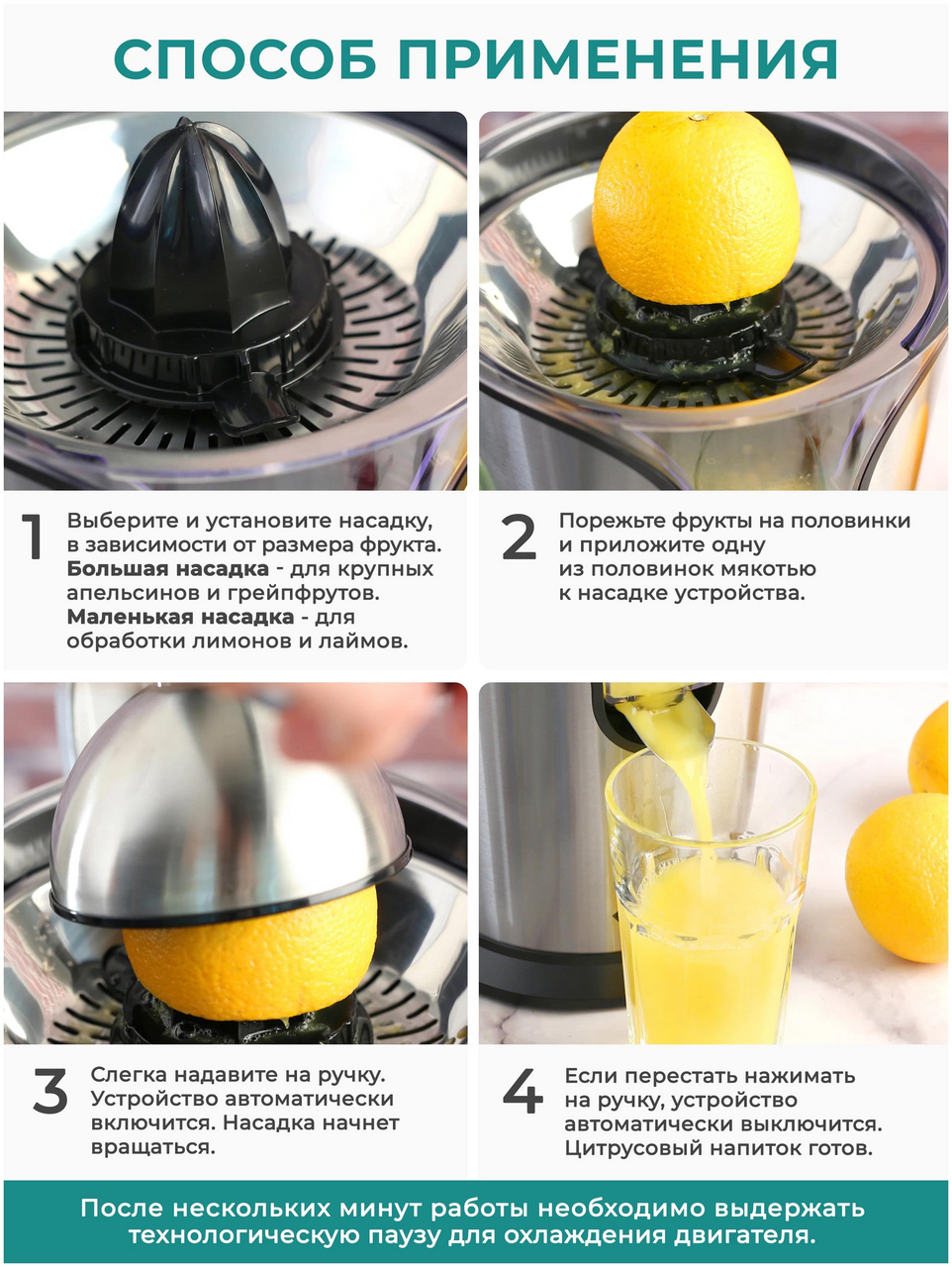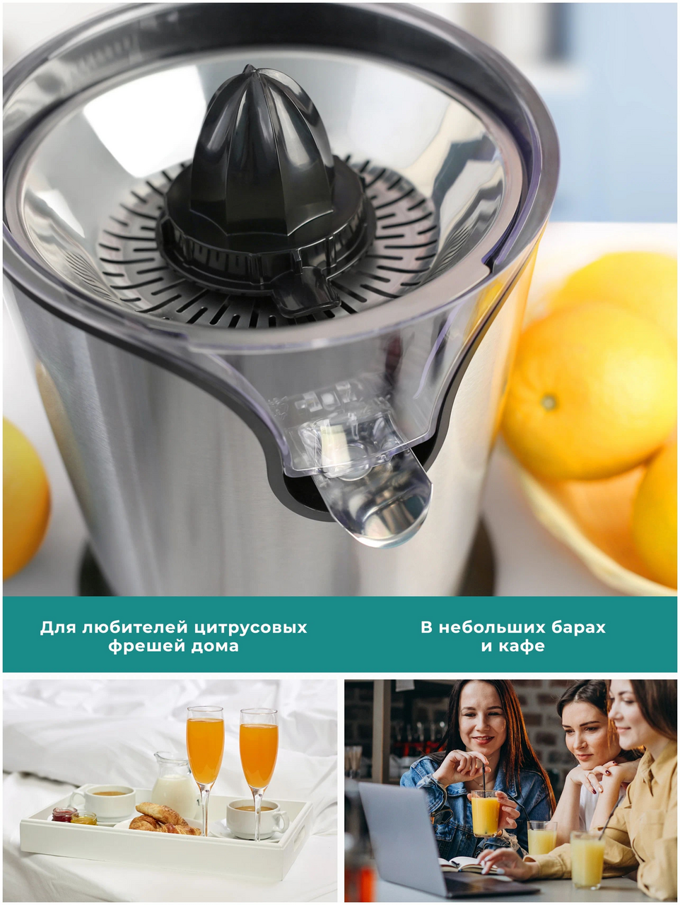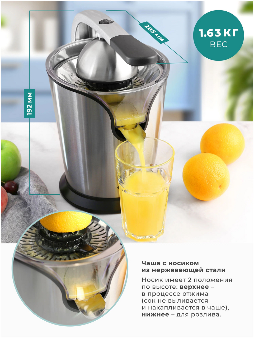 Соковыжималка для цитрусовых Gemlux GL-CJ160 – универсальное устройство, которое непременно найдет свое применение не только на домашней кухне у любителей цитрусовых фрешей, но и в небольших барах и кафе. Оборудование имеет прочный гигиеничный корпус из нержавеющей стали с элементами черной пластмассы, за счет чего данная модель смотрится стильно и профессионально на любой кухне. В комплект соковыжималки Gemlux GL-CJ160 входят: — чаша из прозрачного пластика с указанием максимального уровня сока при отжиме, — фильтр из нержавеющей стали для косточек и мякоти, — два съемных конуса из черной пластмассы для разных видов цитрусовых. Двигатель мощностью 160 Вт (а это высокая мощность для цитрусовых соковыжималок!) и металлический прижимной рычаг позволят вам без особых усилий выжать сок из любых цитрусовых: лимонов, лаймов, апельсинов, грейпфрутов и т. п. Достаточно лишь помыть фрукты и разрезать их пополам. В данной модели предусмотрена прямая подача сока из чаши в стакан. Для этой цели чаша оснащена носиком из нержавеющей стали, который имеет два положения по высоте: верхнее используется в процессе отжима (сок не выливается и накапливается в чаше), нижнее – для розлива. Режим работы соковыжималки Gemlux GL-CJ160 – периодический (повторно кратковременный): после нескольких минут работы необходимо выдержать технологическую паузу для охлаждения двигателя.
