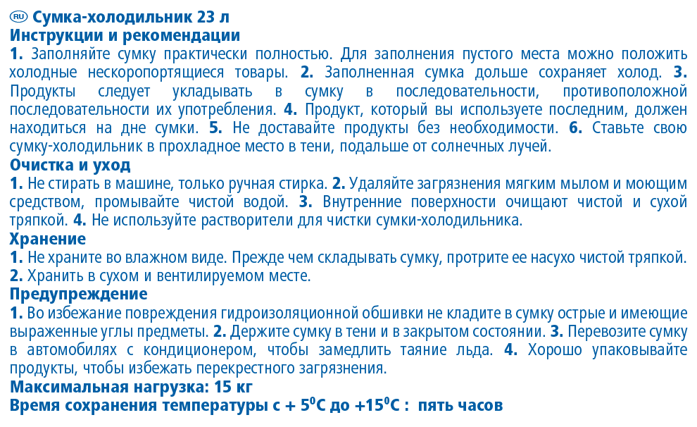 Объем: 23 л. Плинтус из полиэтилена. Охлаждение продуктов в течение 5 часов. Размер изделия: 29 х 29 х 30,2 см. Материал: Оксфорд с покрытием из ПВХ (поливинилхлорида). Толщина изделия: Оксфорд: 0,3 мм; Губка-вкладыш: 10 мм; PE (полиэтилен): 0,143 мм. Цвет: PE (полиэтилен) белого цвета, ручка синего цвета. Макс. Загрузка: 15 кг.