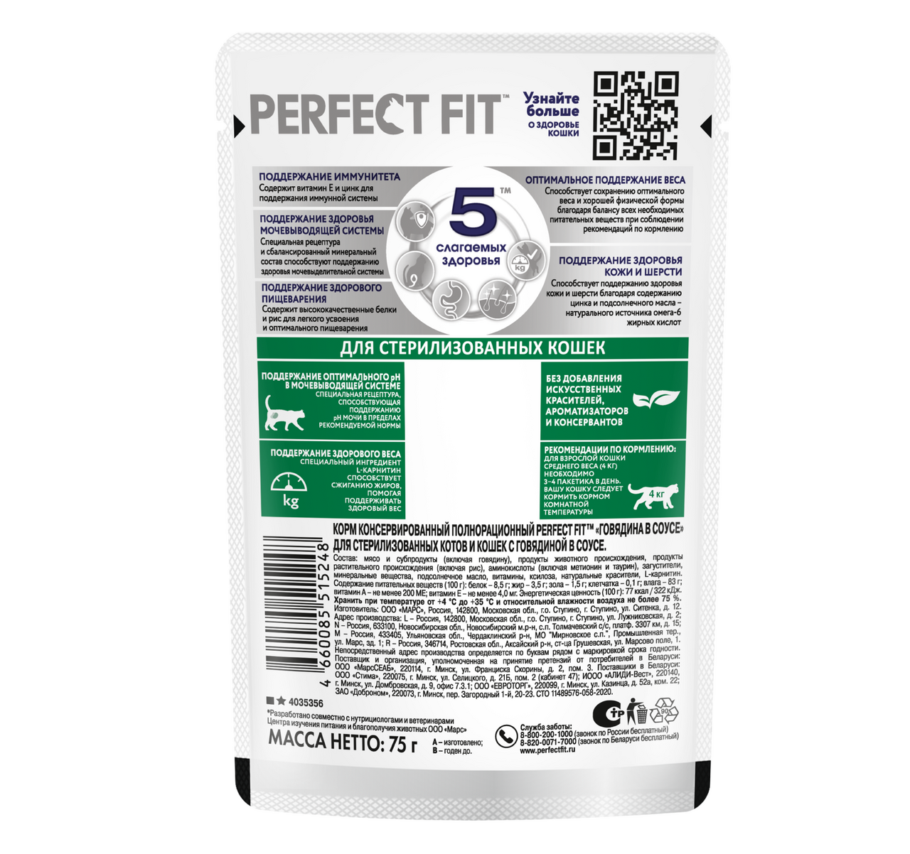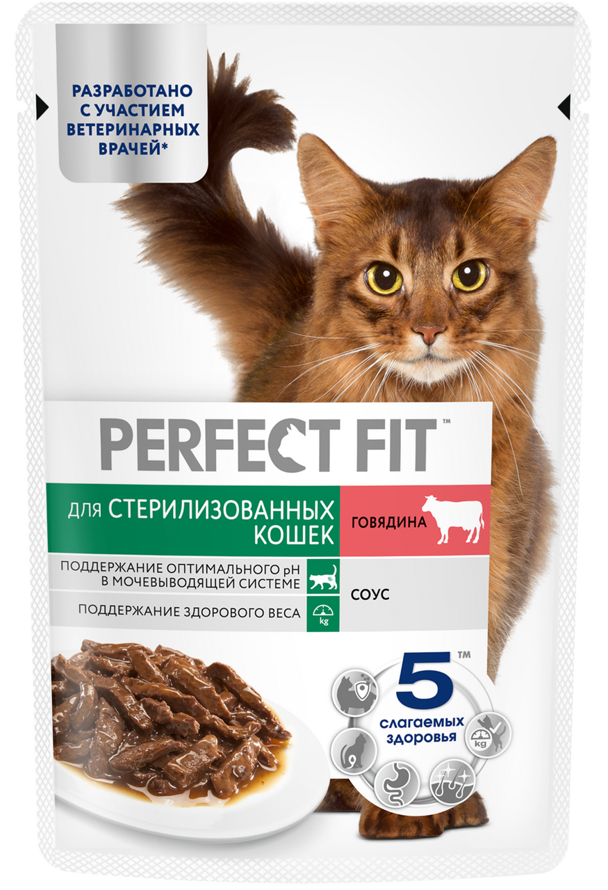 Влажный корм в паучах Perfect Fit с говядиной в соусе для стерилизованных кошек разработан по специальной рецептуре для контроля здоровья кошек, прошедших стерилизацию. Здоровье мочевыводящей системы; Поддерживает здоровье мочевыводящей системы у стерилизованных кошек, подверженных повышенному риску развития мочекаменной болезни; Поддержание здорового веса; Специальный ингредиент L-карнитин способствует сжиганию жиров, помогая поддерживать здоровый вес.