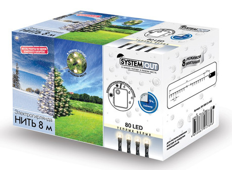Электрогирлянда Нить, 8 м, 80 белых теплых светодиодов, водонепроницаемый блок питания (с таймером), для использования снаружи и внутри помещений. Светодиодные гирлянды серии SYSTEM OUT с водонепроницаемым блоком питания предназначены для использования снаружи и внутри помещения. Гирлянда работает даже при неблагоприятных погодных условиях, ей не страшен ни дождь, ни снег. Блок питания работает от батареек и снабжен встроенным таймером, который автоматически выключает и включает питание. Электрогирлянды серии SYSTEM OUT позволят украсить любые, отдаленные от дома объекты: беседки, деревья, ограждения. Электрогирлянда Нить 8 м, 80 белых теплых светодиодов. С водонепроницаемым блоком питания (батарейки вида АА х 3шт. - не входят в комплект), с контроллером и таймером на 9 часов.