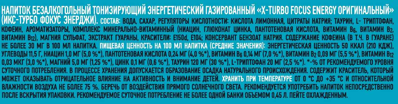 X-Turbo Focus – это источник неукротимой силы и неистощимой энергии. Оригинальный вкус пробуждает чувства, а мощная формула работает на пределе возможностей. В каждой банке X-Turbo Energy скрыта уникальная комбинация ингредиентов: кофеин для максимальной концентрации, таурин для устойчивости к стрессу и витамины, которые помогают победить усталость. Почувствуйте, как мощь внутри вас разгорается с каждым глотком, повышая реакцию и обостряя внимание. X-Turbo Energy — это ваш путь к вершинам успеха и новым достижениям. Откройте банку и ощутите настоящую силу!