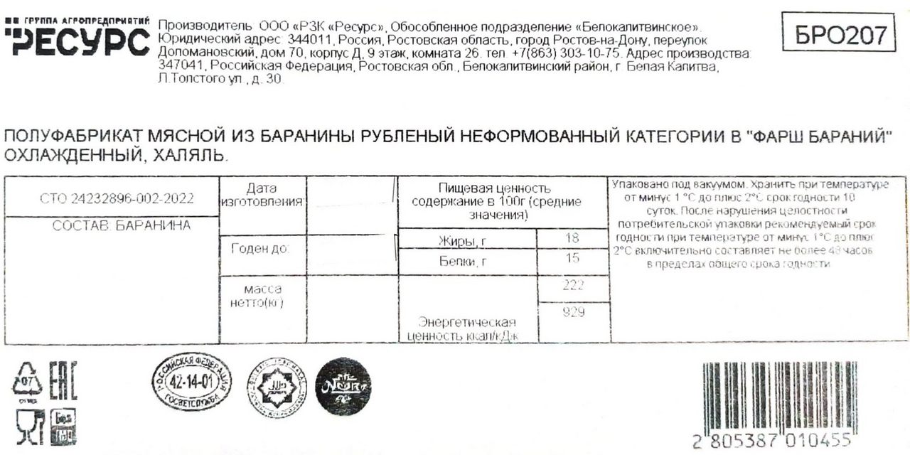 Фарш бараний An-Noor Халяль охлажденный, ~1кг