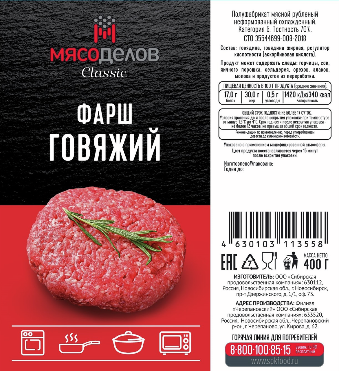 Натуральный мясной фарш из говядины, в готовом виде, в меру сочный, его можно использовать для приготовления котлет (жаренных или паровых), тефтелей, фрикаделек, макарон по-флотски и т.д. Фарш приготовлен из высококачественной говядины. Отличается однородной структурой и характерным говяжьему мясу красным цветом. Сочный, с небольшим количеством жира, этот фарш подходит для приготовления котлет, тефтелей, запеканок, начинки для пирогов, чебуреков, беляшей.