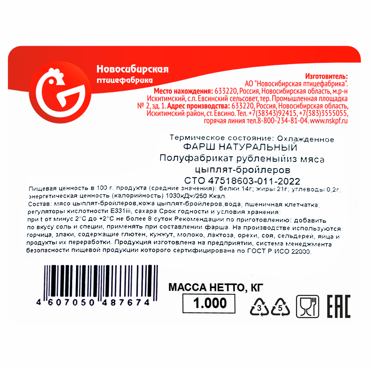 Фарш из цыпленка-бройлера Новосибирская птицефабрика натуральный охлажденный, 1кг