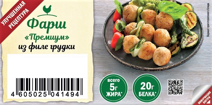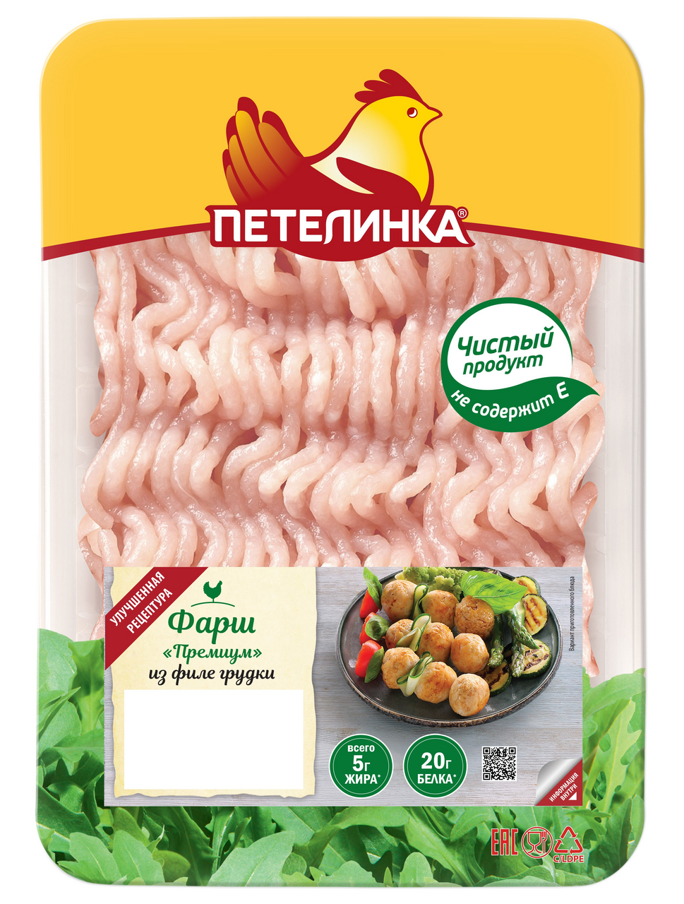 Фарш Премиум из филе грудки производится под брендом Петелинка и не содержит Е-добавок. Нежирное куриное мясо оптимально подходит для диетического или здорового питания. Благодаря отсутствию крупных фрагментов из охлажденного полуфабриката получаются нежные домашние котлеты, фрикадельки, тефтели. Фарш используют в качестве начинки для пирогов, беляшей, пиццы, блинов, а также для приготовления пельменей, голубцов, макарон по-флотски.