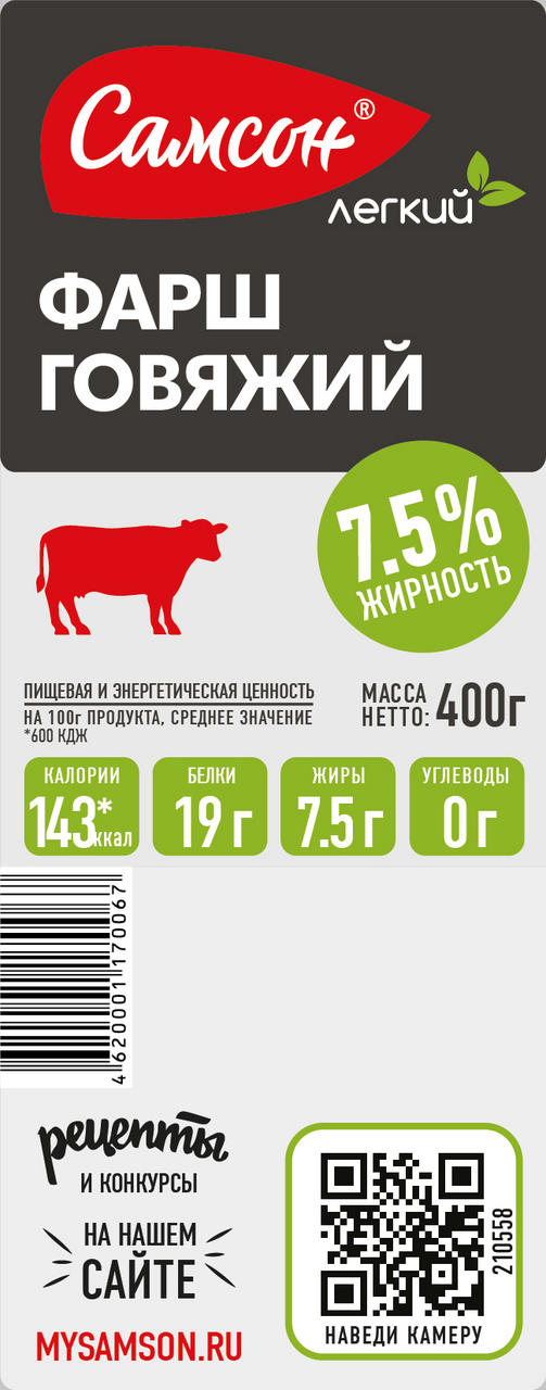 Фарш Говяжий охлажденный Самсон, 400 г – это аппетитный мясной продукт, изготовленный в соответствии с требованиями ГОСТ из отборной говядины. Для его получения производитель использует преимущественно постные части туши, поэтому в фарше содержится всего 7,5% жира и около 19% белка. Такой продукт богат необходимыми для здоровья аминокислотами, железом, калием, магнием, фосфором, другими микро- и макроэлементами, а также витаминами из группы В. Употребление говядины полезно как для взрослых, так и для детей. Это мясо способствует укреплению костной и мышечной ткани, снижает риск развития анемии, положительно сказывается на здоровья сердца и сосудов, помогает повысить иммунитет. Нежирное и легко усваивающееся мясо помогает быстро утолить голод и пополнить запас сил и энергии, может без опасений включаться даже в диетическое меню. Перемолотая в фарш говядина используется для приготовления разных блюд. Ее можно класть в блинчики и пироги в качестве начинки, готовить запеканки и голубцы, фаршировать перцы, баклажаны, кабачки и другие овощи. Из говяжьего фарша получаются аппетитные котлеты и фрикадельки, которые можно запекать, жарить или использовать для приготовления супов. Продукт продается в охлажденном виде, поэтому его можно сразу же подвергать термической обработке. Практичная вакуумная упаковка надежно сохраняет свежесть мясного полуфабриката. Фарш изготовлен из прошедшего тщательный входной контроль натурального мяса и не содержит ГМО, консервантов, ароматизаторов и искусственных красителей.