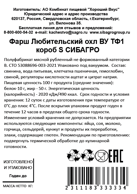 Фарш Сибагро любительский охлажденный ГОСТ, ~1кг
