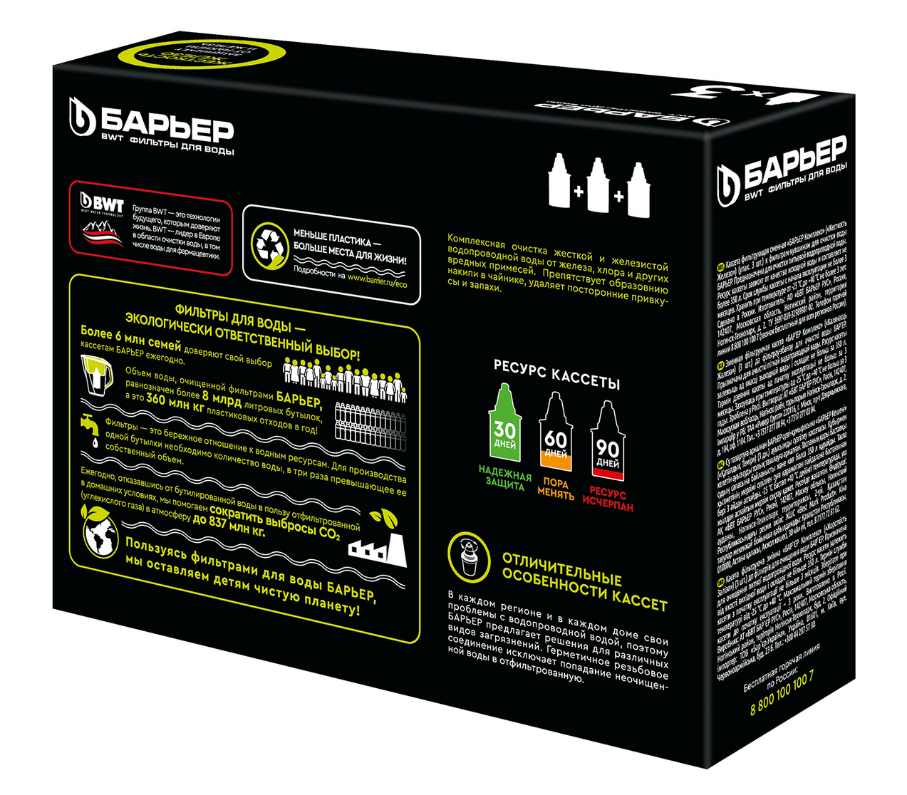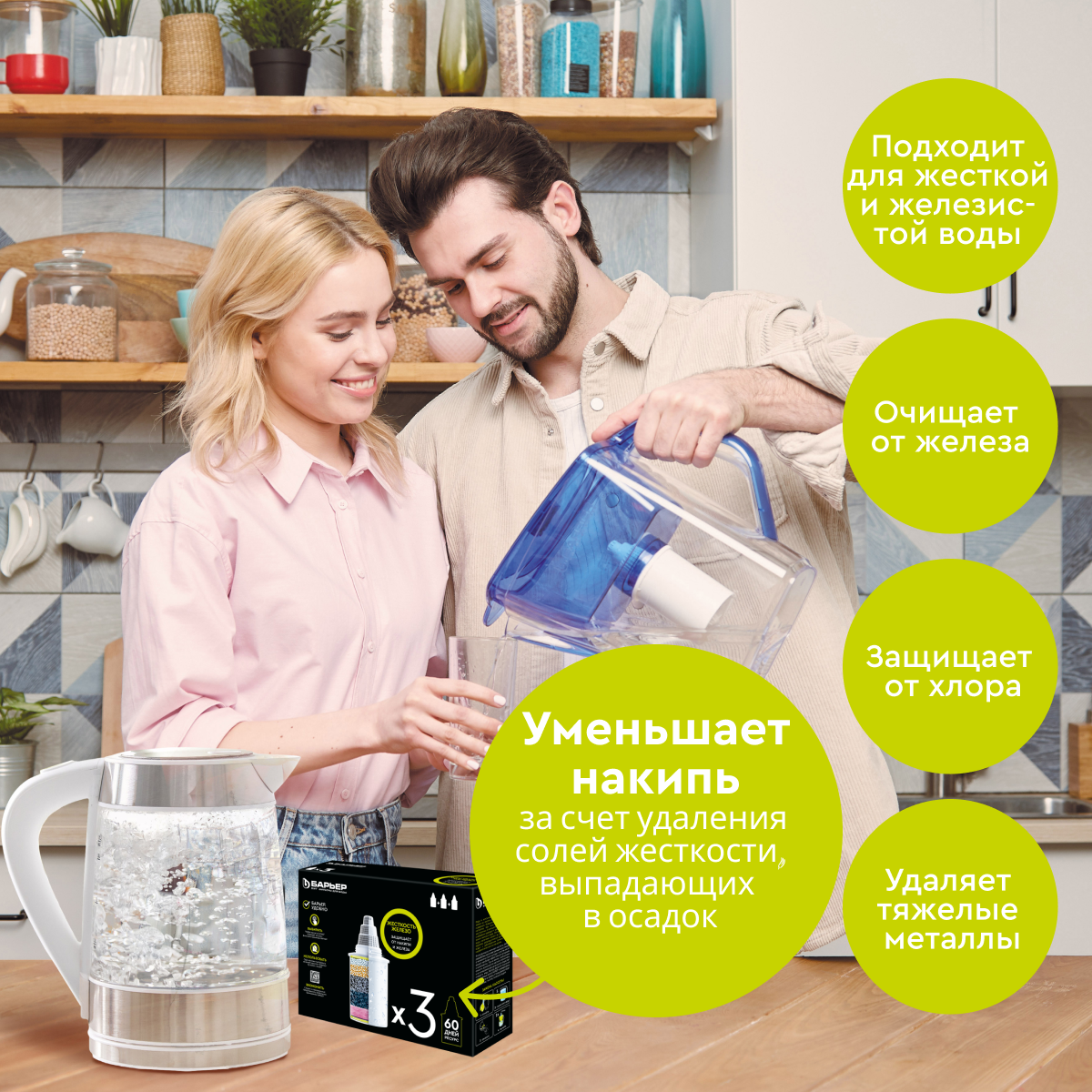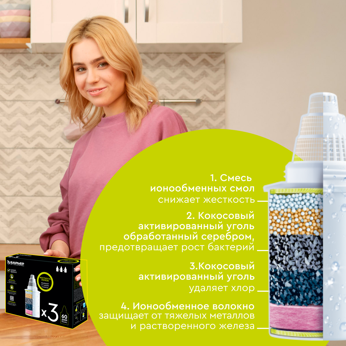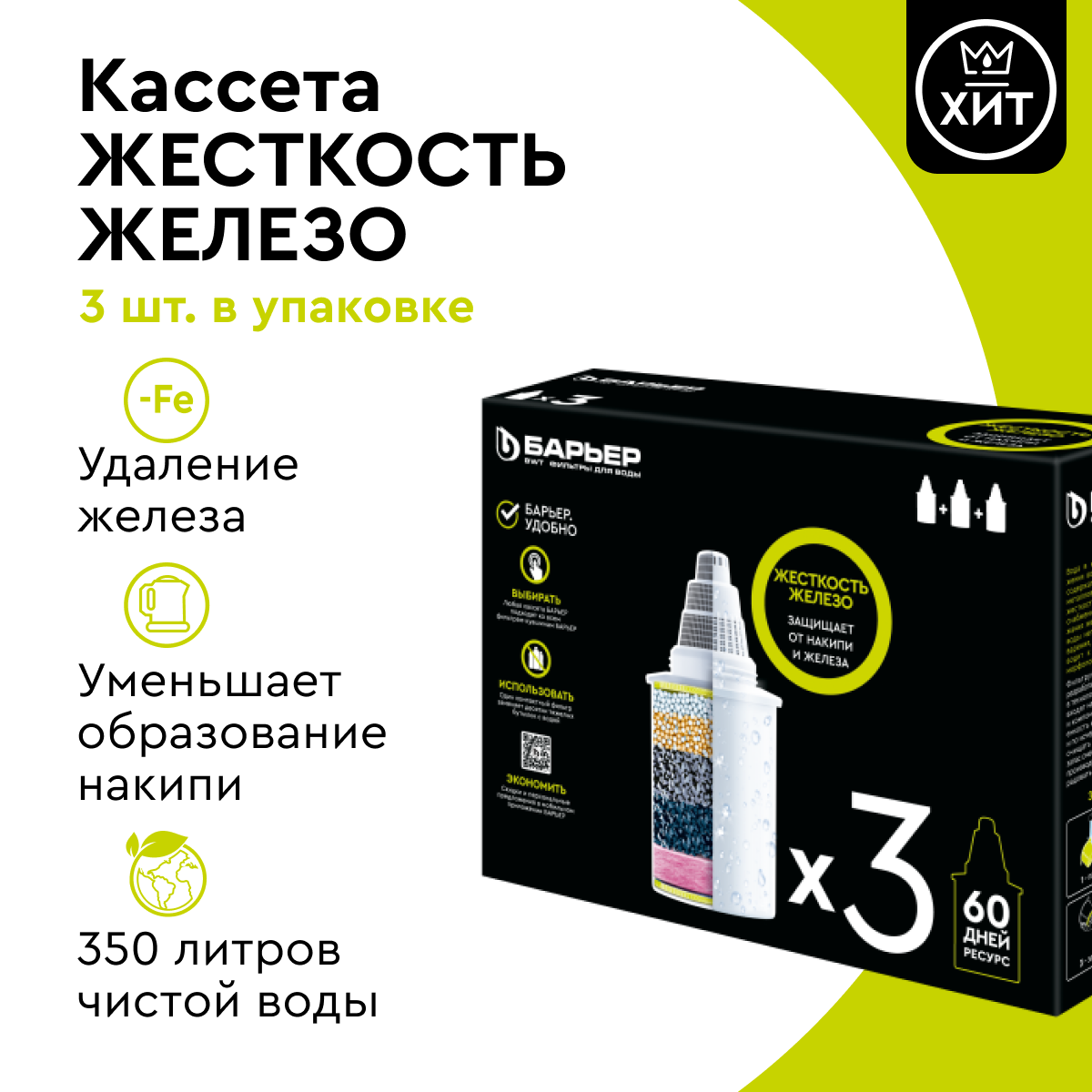 Комплект из 3 сменных кассет для фильтра БАРЬЕР Жесткость Железо. Снижает жесткость, которую мы привыкли встречать в жизни в виде накипи, удаляет из воды растворенное железо и неприятный металлический привкус, а также, как и все кассеты БАРЬЕР, очищает от хлора, тяжелых металлов и других вредных примесей. Результат – чистая вода без накипи, рыжеватого осадка и неприятного привкуса. Ресурс каждой кассеты — 350 литров.С фильтрами БАРЬЕР вам не придется запоминать размер или диаметр сменной кассеты: любая кассета БАРЬЕР подходит ко всем фильтрам-кувшинам БАРЬЕР. А герметичное резьбовое соединение исключает попадание неочищенной воды в отфильтрованную.Ресурс зависит от качества исходной воды, но составляет не более 350 литров для каждой кассеты. Использование фильтра-кувшина вместо литровых бутылей на постоянной основе выгоднее в 165 раз и помогает уберечь планету более чем от тонны пластика.