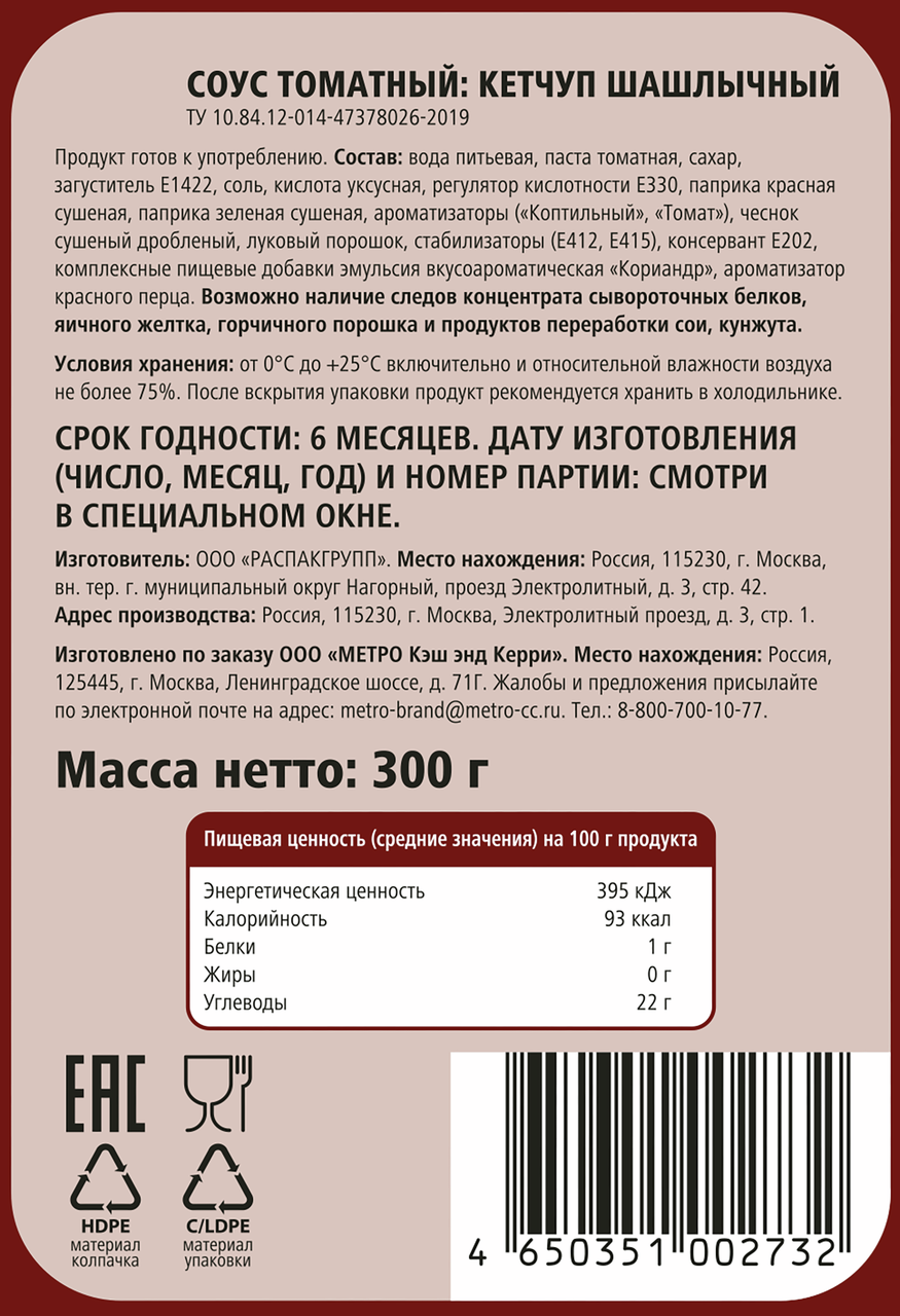 Вода питьевая, паста томатная, сахар, загуститель Е1422, соль, кислота уксусная, регулятор кислотности Е330, паприка красная сушёная, паприка зелёная сушёная, ароматизаторы Коптильный, Томат, чеснок сушёный дроблёный, луковый порошок, стабилизаторы E412, Е415, консервант Е202, комплексные пищевые добавки эмульсия вкусоароматическая Кориандр, ароматизатор красного перца.