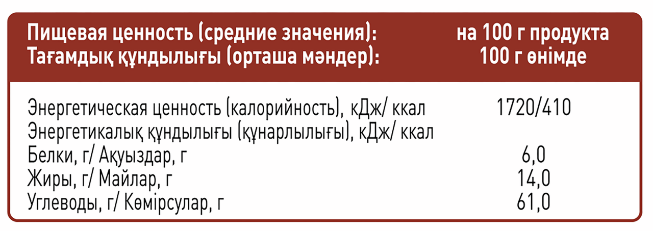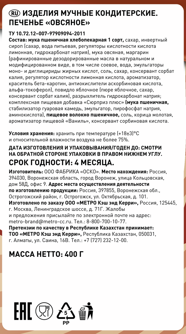 Мука пшеничная хлебопекарная 1 сорт, сахар, инвертный сироп сахар, вода питьевая, регуляторы кислотности кислота лимонная, гидрокарбонат натрия, мука овсяная, маргарин рафинированные дезодорированные масла в натуральном и модифицированном виде, в том числе соевое, вода, эмульгаторы моно - и диглицериды жирных кислот, соль, сахар, консервант сорбат калия, регулятор кислотности лимонная кислота, ароматизатор, краситель бета-каротин, антиокислители аскорбиновая кислота, альфа-токоферол, повидло яблочное пюре яблочное, сахар, консервант сорбат калия, разрыхлитель гидрокарбонат натрия; комплексная пищевая добавка Сюрприз плюс мука пшеничная, стабилизатор гуаровая камедь, эмульгатор, пирофосфат натрия, аминокислота, пищевое волокно пшеничное, соль, корица молотая, ароматизатор пищевой Ваниль, консервант сорбиновая кислота.