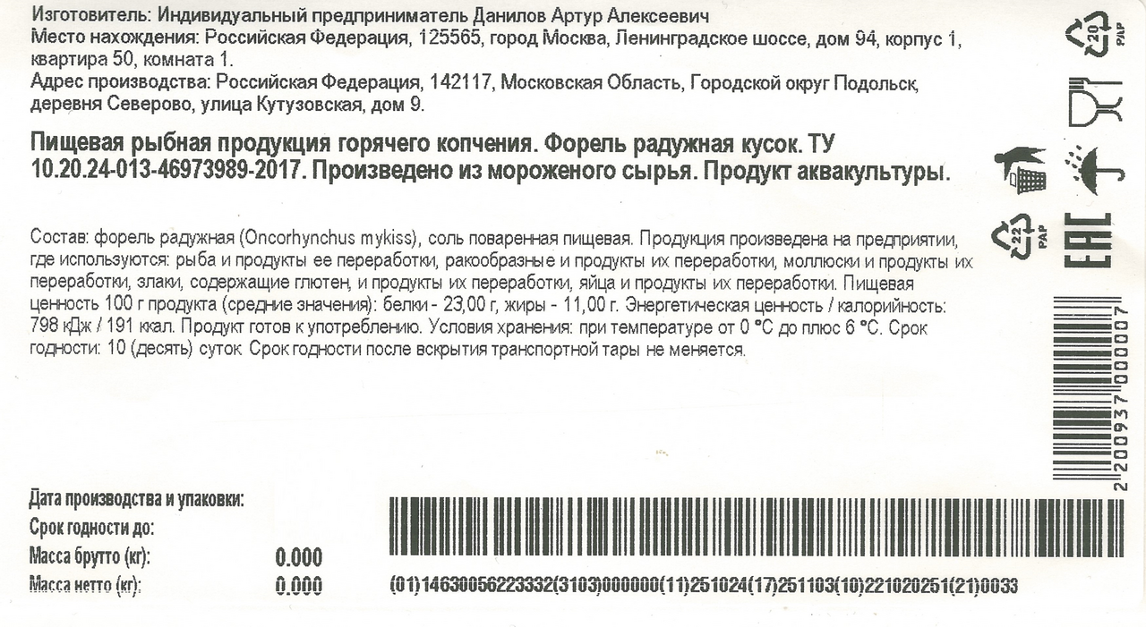Форель радужная Oncorhynchus mykiss, соль поваренная пищевая.