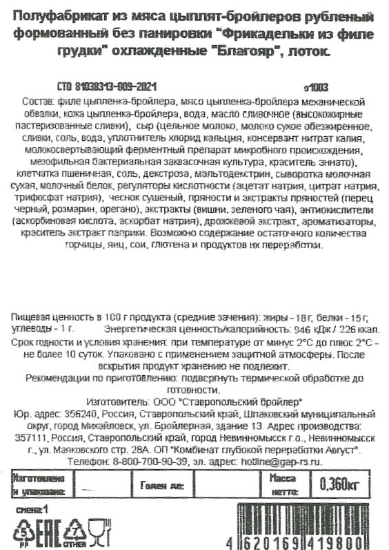 Филе цыпленка-бройлера, мясо цыпленка-бройлера механической обвалки, кожа цыпленка-бройлера, вода, лук репчатый, масло сливочное (высокожирные пастеризованные сливки), сыр (цельное молоко, молоко сухое обезжиренное, заменитель молочного жира (рафинированные дезодорированные растительные масла (пальмовое, подсолнечное, соевое), эмульгаторы (Е471, Е322), антиокислители (Е320, Е321), краситель Е160b), соль, вода, уплотнитель хлорид кальция, консервант нитрат калия, молокосвертывающий ферментный препарат микробного происхождения, мезофильная бактериальная заквасочная культура, краситель аннато), клетчатка пшеничная, соль, декстроза, мальтодекстрин, сыворотка молочная сухая, молочный белок, регуляторы кислотности (ацетат натрия, цитрат натрия, пирофосфат натрия, трифосфат натрия), чеснок сушеный, пряности и экстракты пряностей (перец черный, розмарин, орегано), экстракты (вишни, зеленого чая), антиокислители (аскорбиновая кислота, аскорбат натрия), дрожжевой экстракт, ароматизаторы, краситель экстракт паприки. Возможно незначительное содержание горчицы, яиц, орехов, кунжута, глютена, сельдерея, диоксида серы и сульфитов, арахиса и продуктов их переработки.
