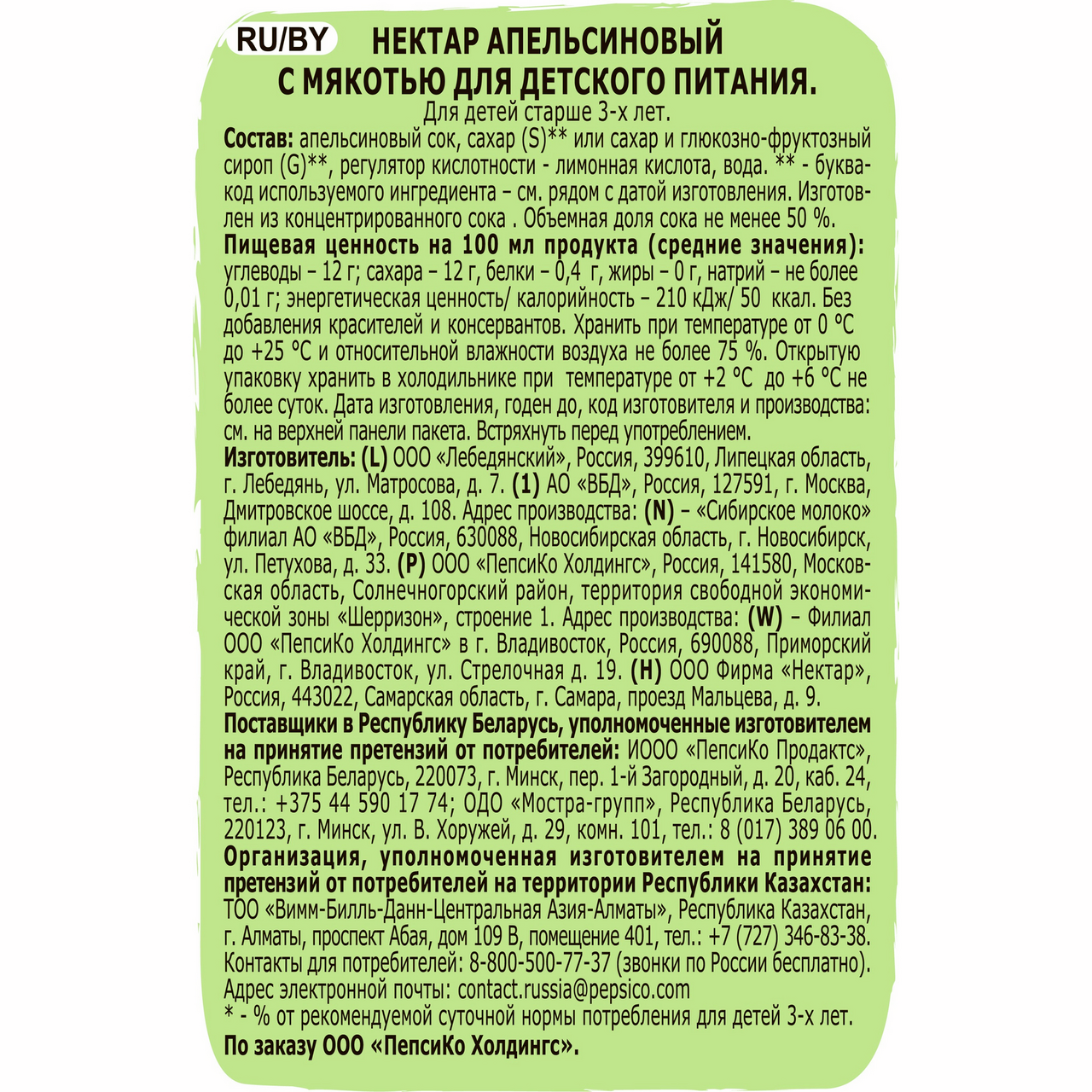 Апельсиновый сок, сахар (S) или сахар и глюкозно-фруктозный сироп (G), регулятор кислотности – лимонная кислота, вода.