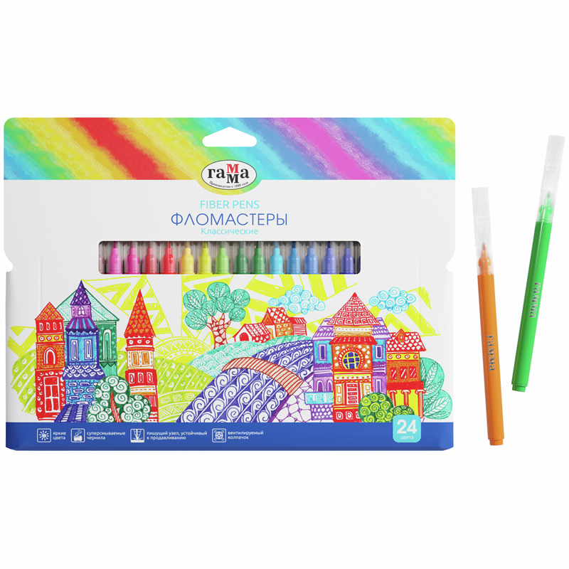 Фломастеры Гамма серии "Классическая" созданы для комфортного рисования. Конический тип наконечника имеет толщину линии письма до 2,6 мм. В наборе 24 цвета. Фломастеры серии "Классические" - это удобная упаковка-конверт, насыщенные цвета и тонкий наконечник, который позволяет наносить тонкие, четкие штрихи и развивать правильную технику рисования у детей. Чернила на основе воды и пищевых красителей, легко смываемые с одежды и рук, избавят от хлопот после рисования. Широкая цветовая палитра дает ребенку неограниченные возможности для творчества, развивая его художественные способности